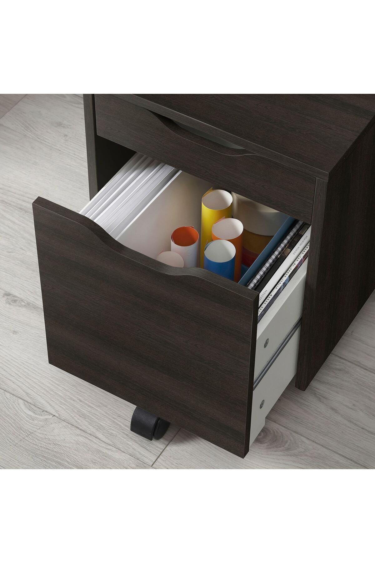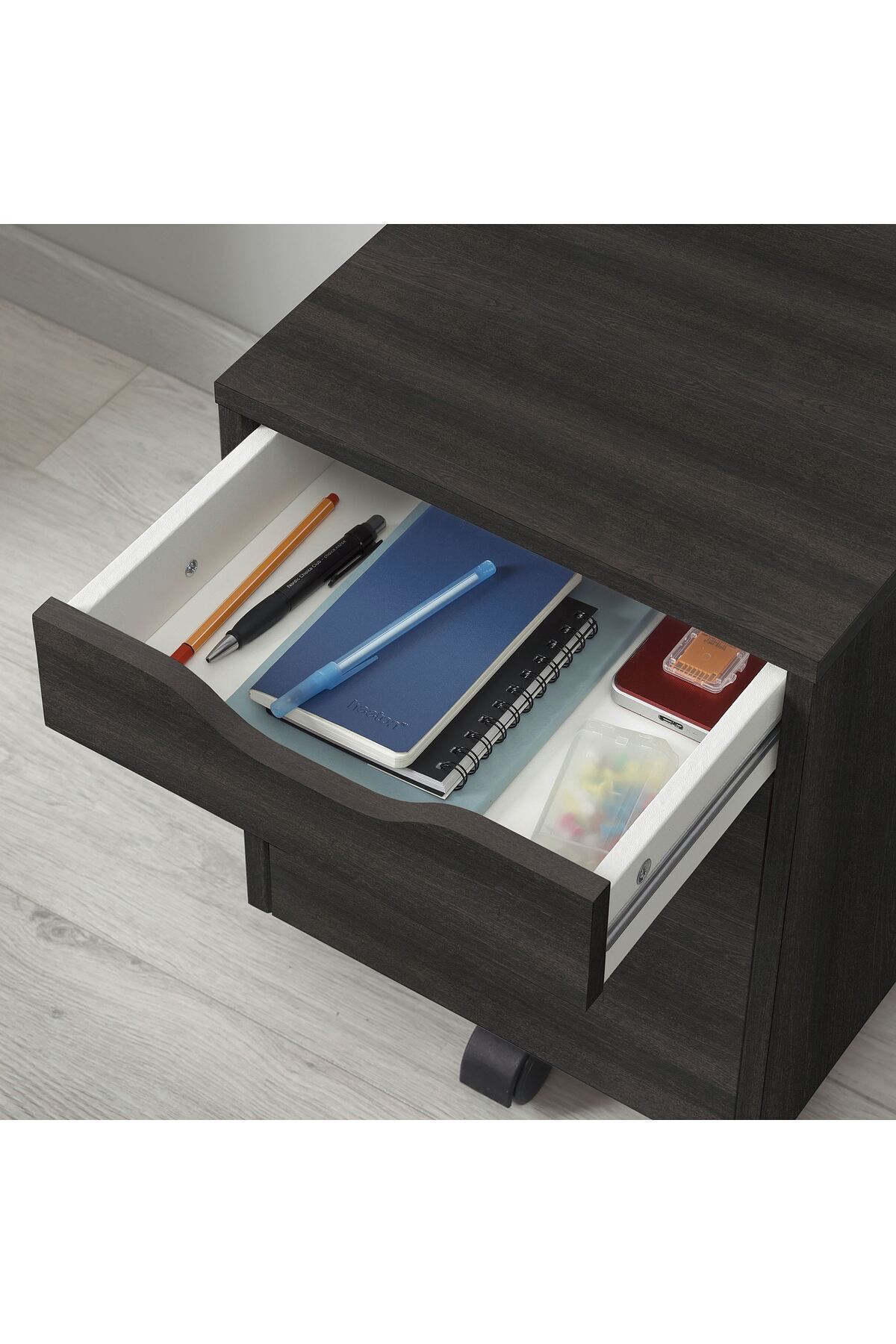 Üst çekmece kalemleri ve diğer küçük eşyaları saklamak için, alt çekmece ise daha büyük eşyalar için kullanılabilir.