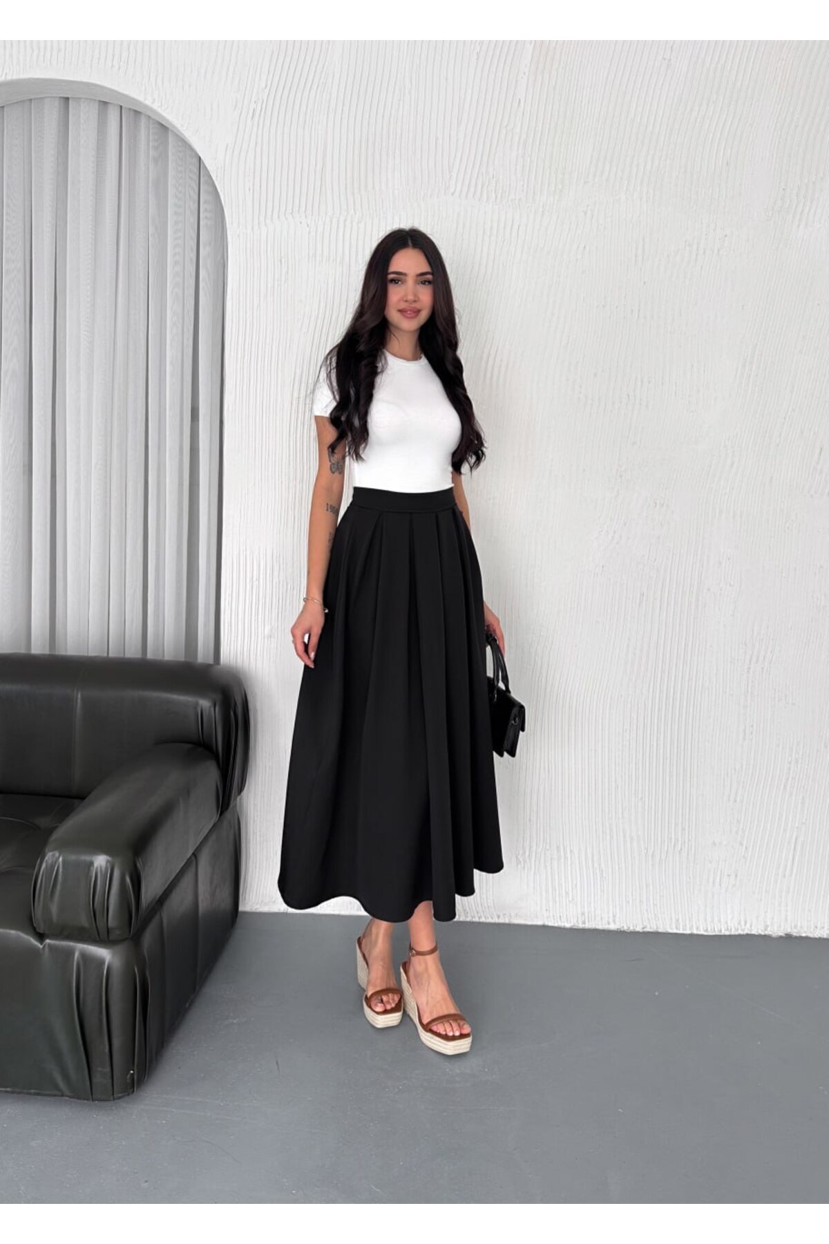 Tesettür giyim stilinizi zarafetle buluşturan bu pileli uzun etek, sade şıklığı ve konforu bir arada sunuyor.