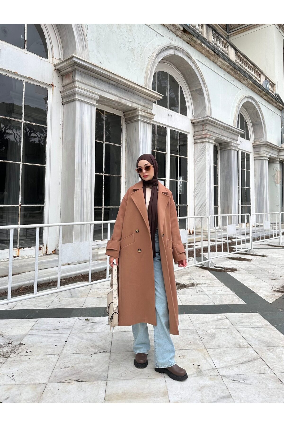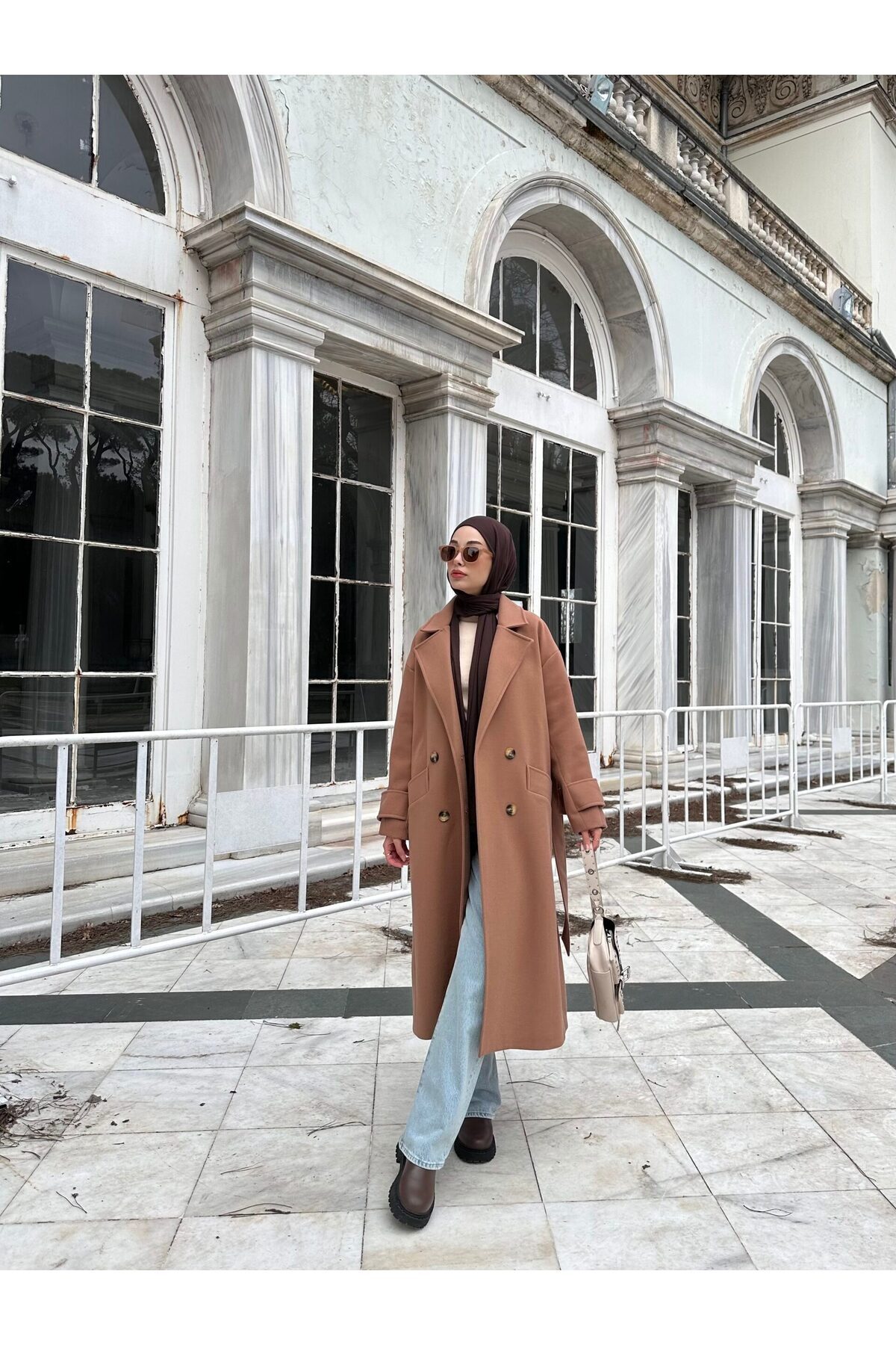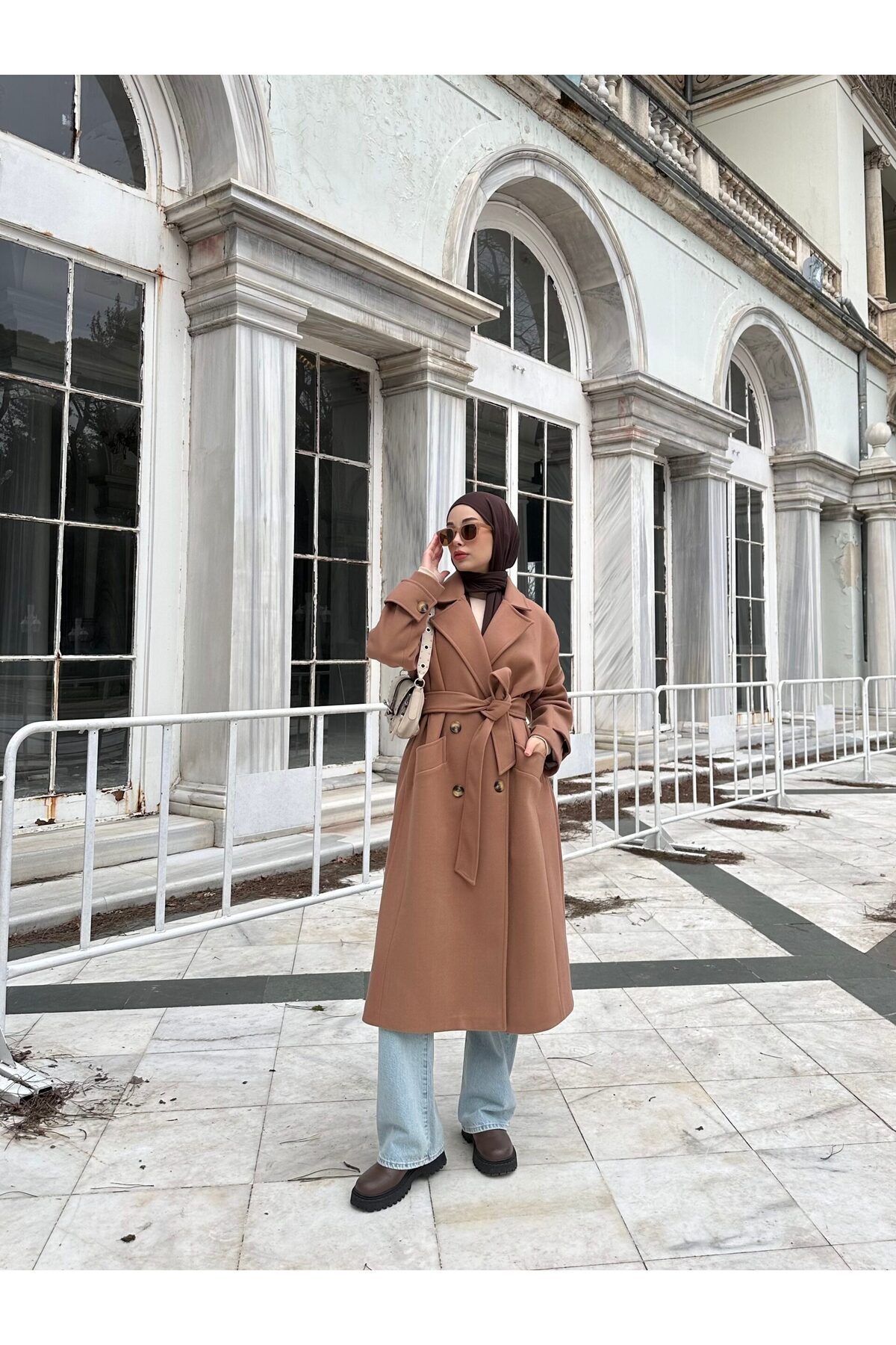 - Unisex tasarımı ile hem kadınların hem de erkeklerin rahatlıkla tercih edebileceği, şıklığı ve konforu bir arada sunan kemerli camel kaşe kaban.
