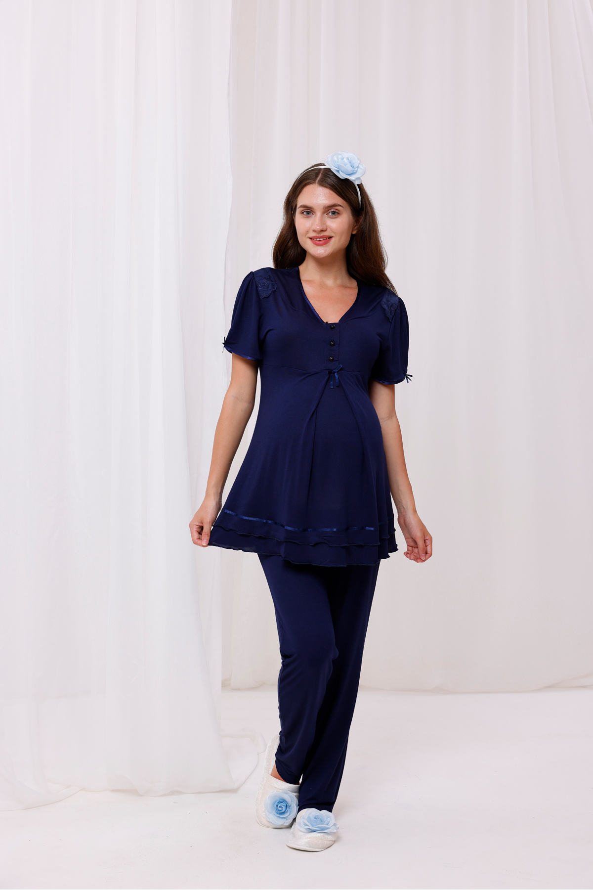 -Ekru rengi ve kurdele detaylarıyla şıklığı ve rahatlığı bir arada sunan hamile pijama takımı, lohusa döneminde konforunuzu ön planda tutar.