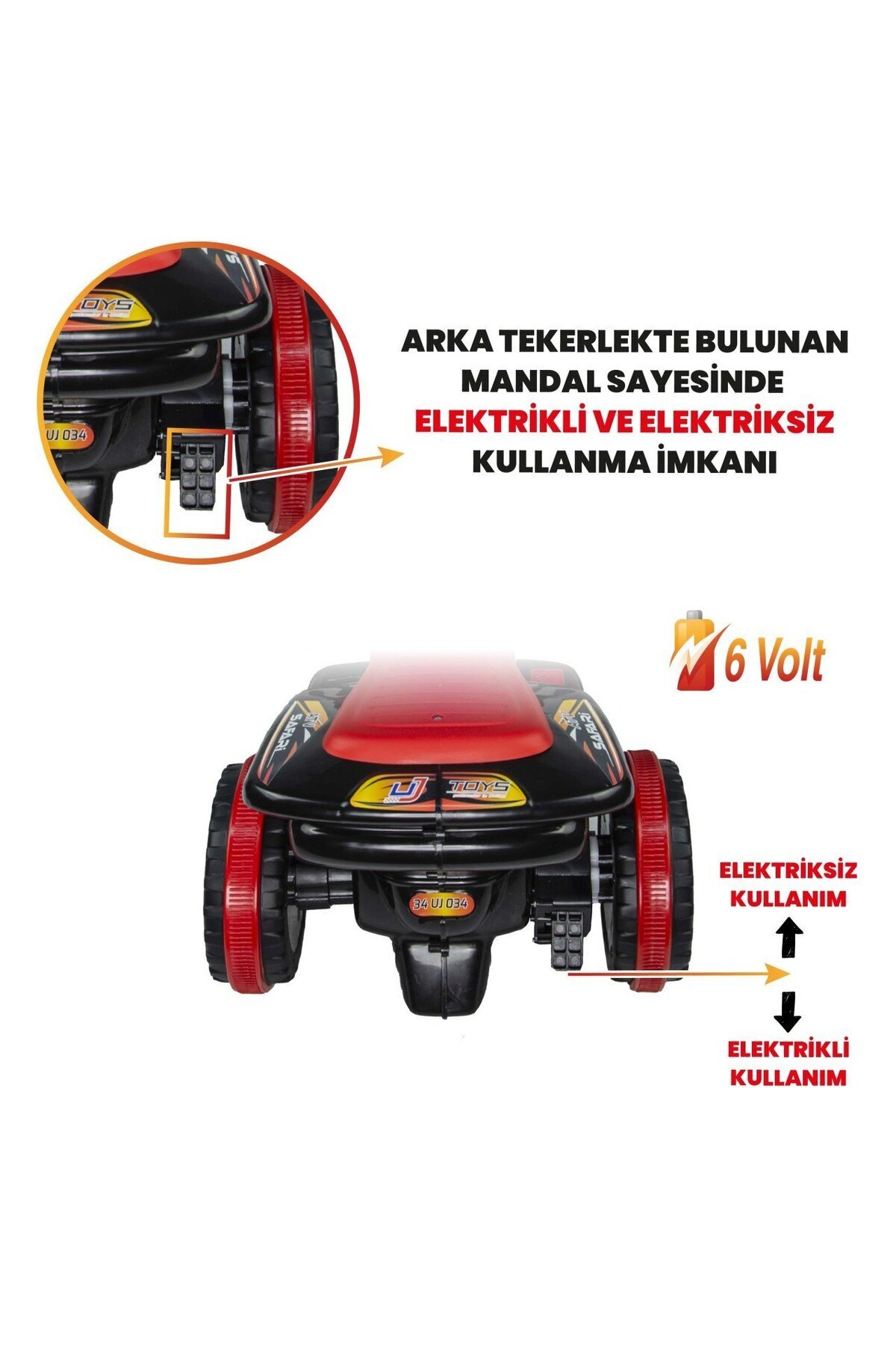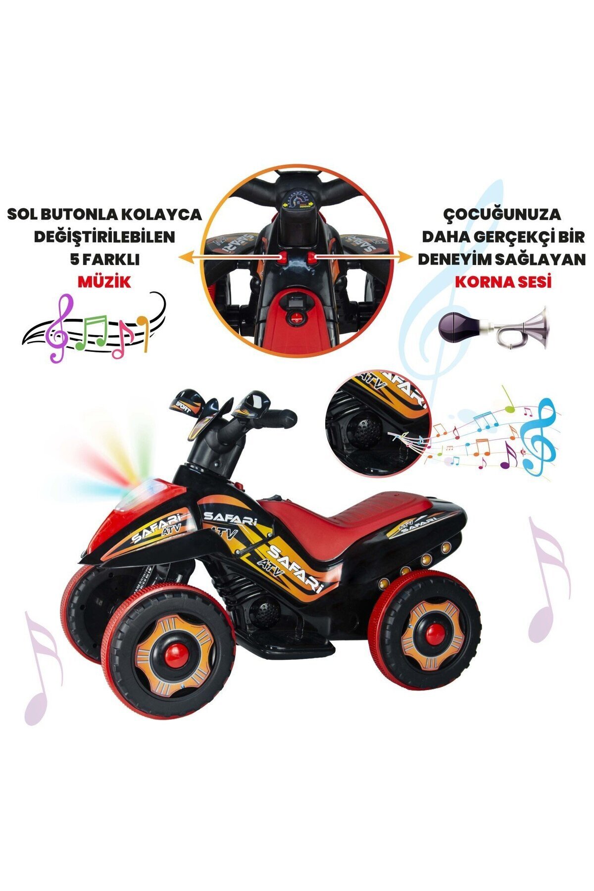 Korna sesi ve 3 ayrı müzik özelliği Gaz Pedalı Kırmızı ve mavi Led ışık özelliği Atv boyutları: 68 X 38 X 48,5 cm Koli Ebatı: 60 X 30 X 34 cm Desi:21 dm3