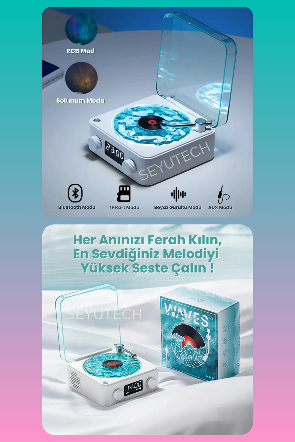 Waves Retro Bluetooth Hoparlör Nostalji Plak Görünümlü 3D Ses Dalgası Işıklı Galaksi Gece Lambası