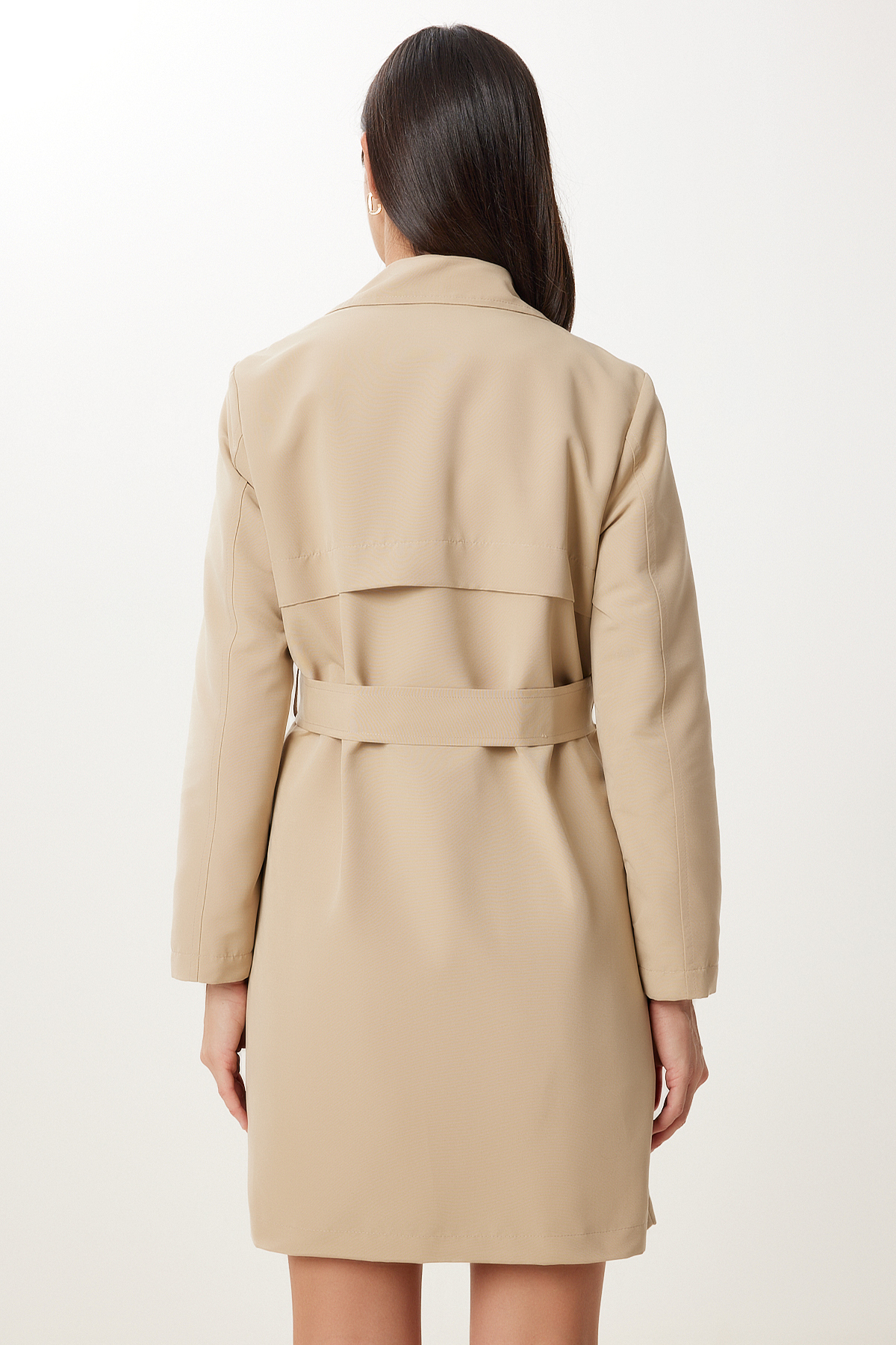Kruvaze yaka, astarlı, yan cepli, kuşaklı kısa dokuma trençkot