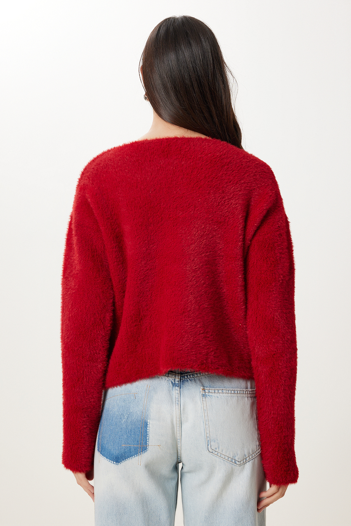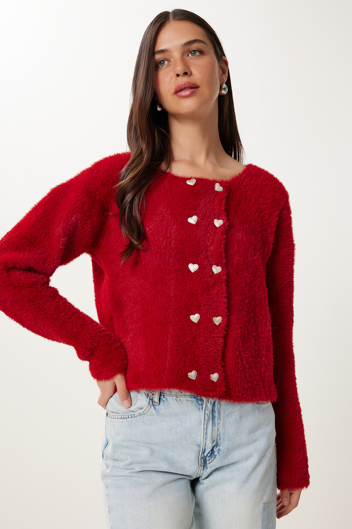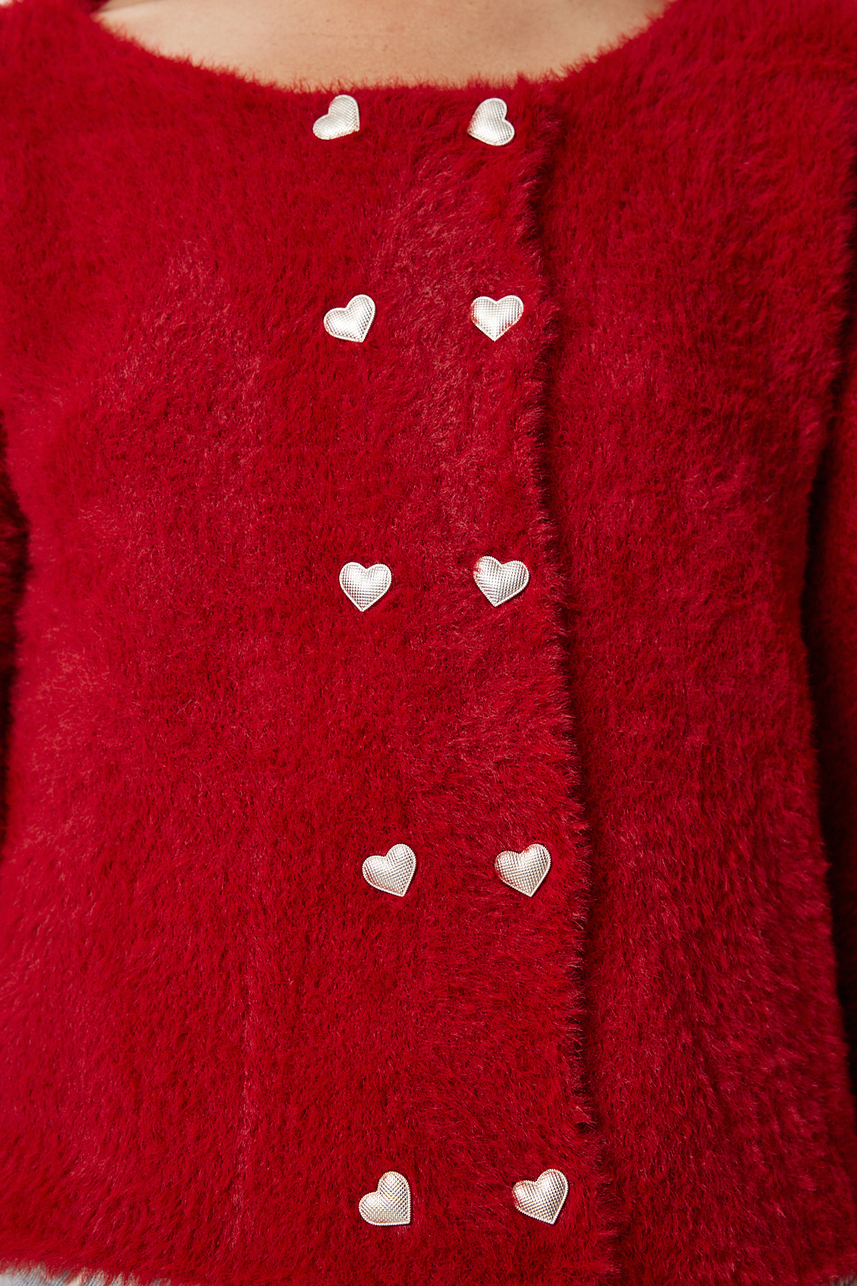 Bisiklet yaka, şık kalp düğme kapamalı, esnek yapılı, yumuşak dokulu triko hırka