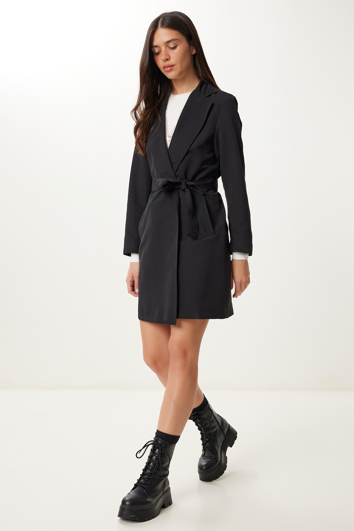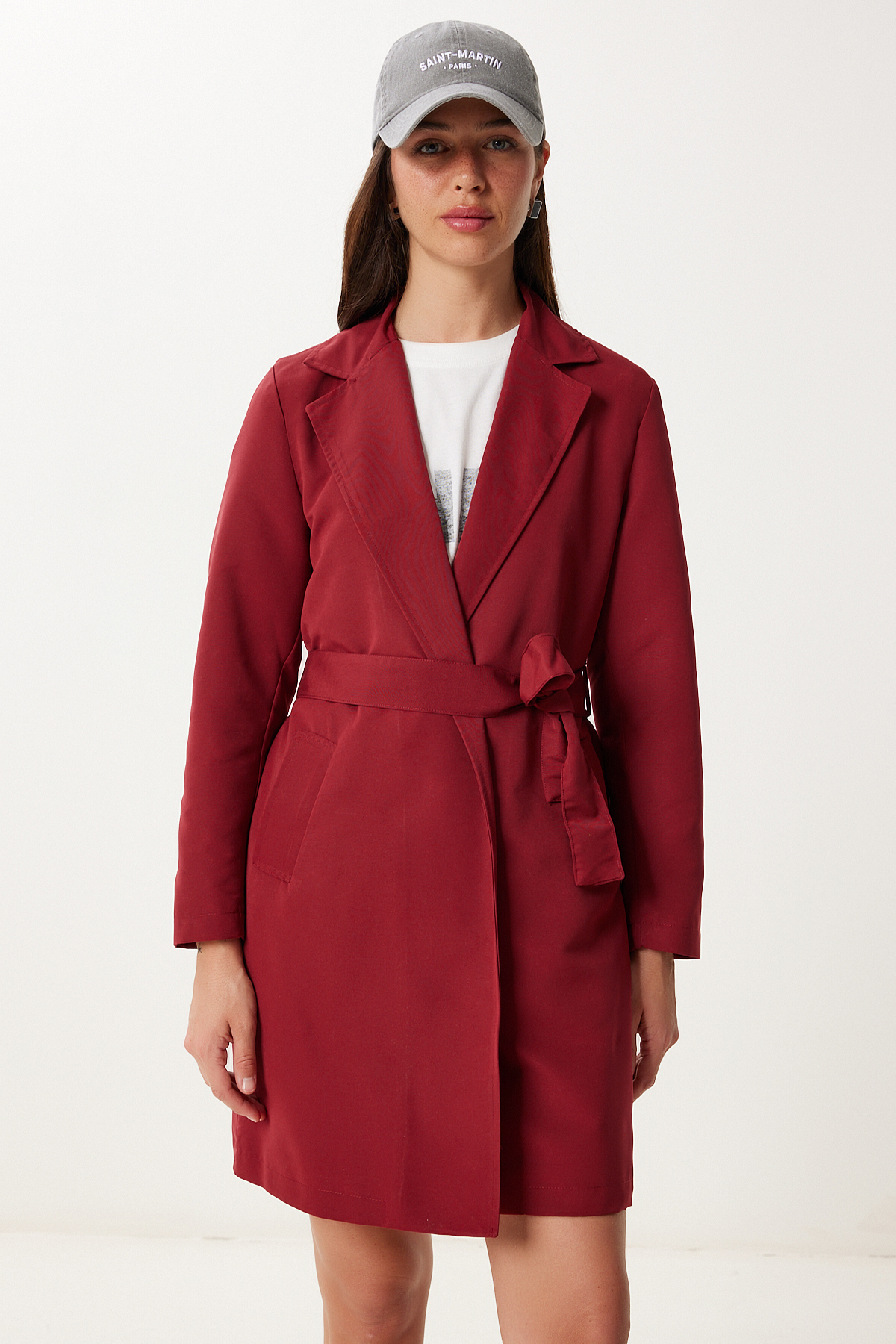 Kruvaze yaka, astarlı, yan cepli, kuşaklı kısa dokuma trençkot