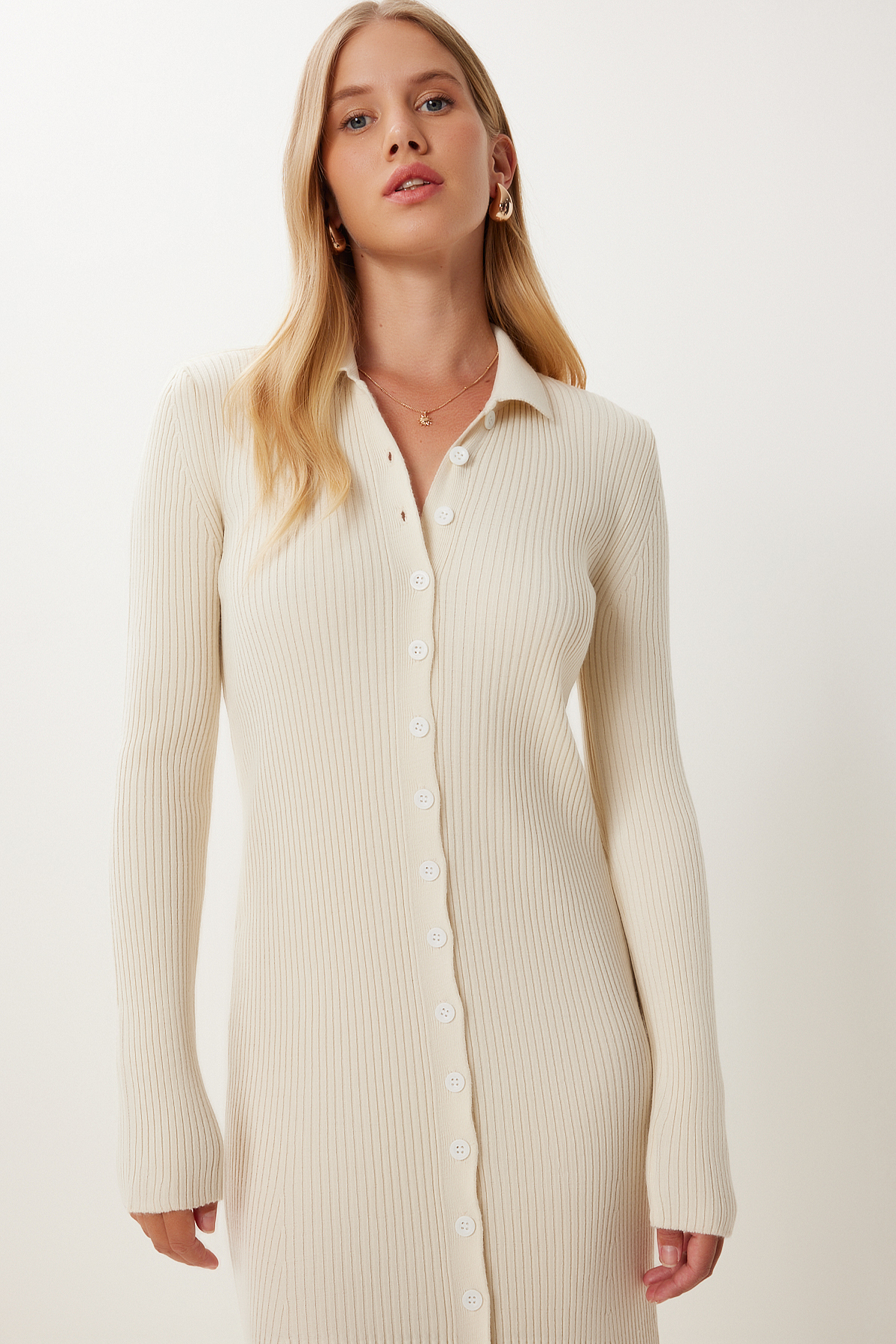 Polo yaka, düğme kapamalı, esnek yapılı, midi fitilli triko elbise