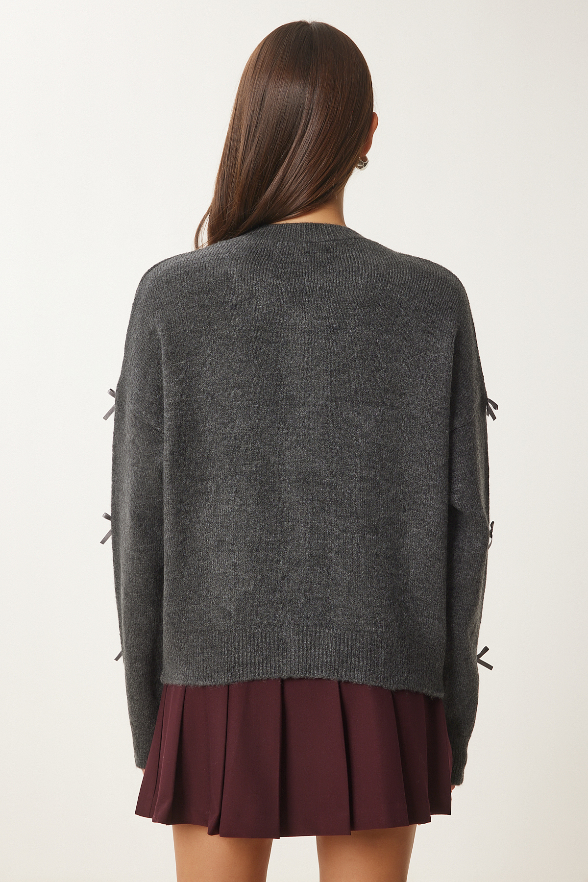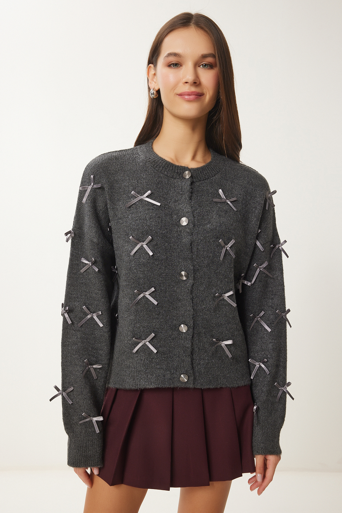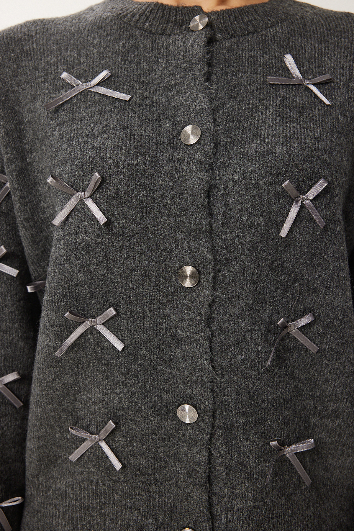 Bisiklet yaka, düşük omuzlu, metal düğme kapamalı, esnek yapılı,fiyonklu triko hırka