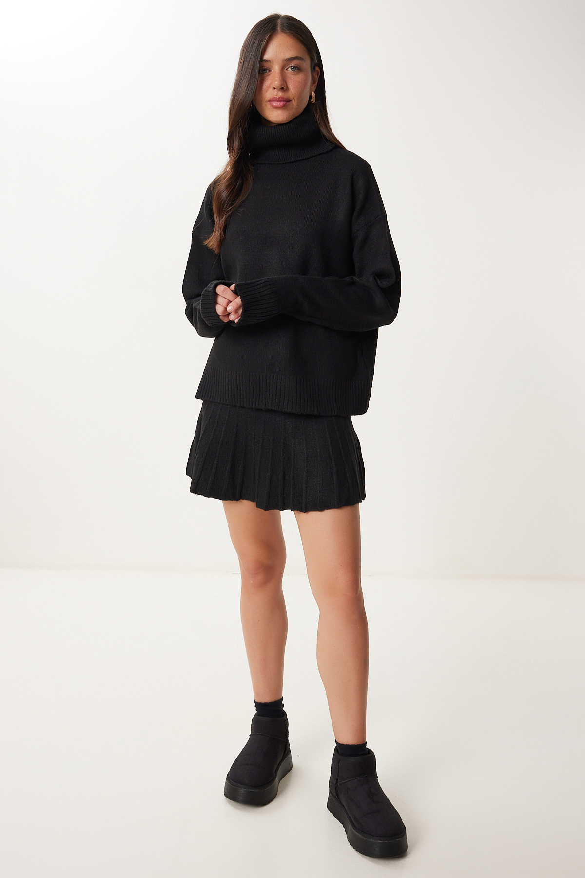 Balıkçı yaka, düşük omuzlu kazak ve elastik bel, astarsız, mini etekten oluşan triko takım