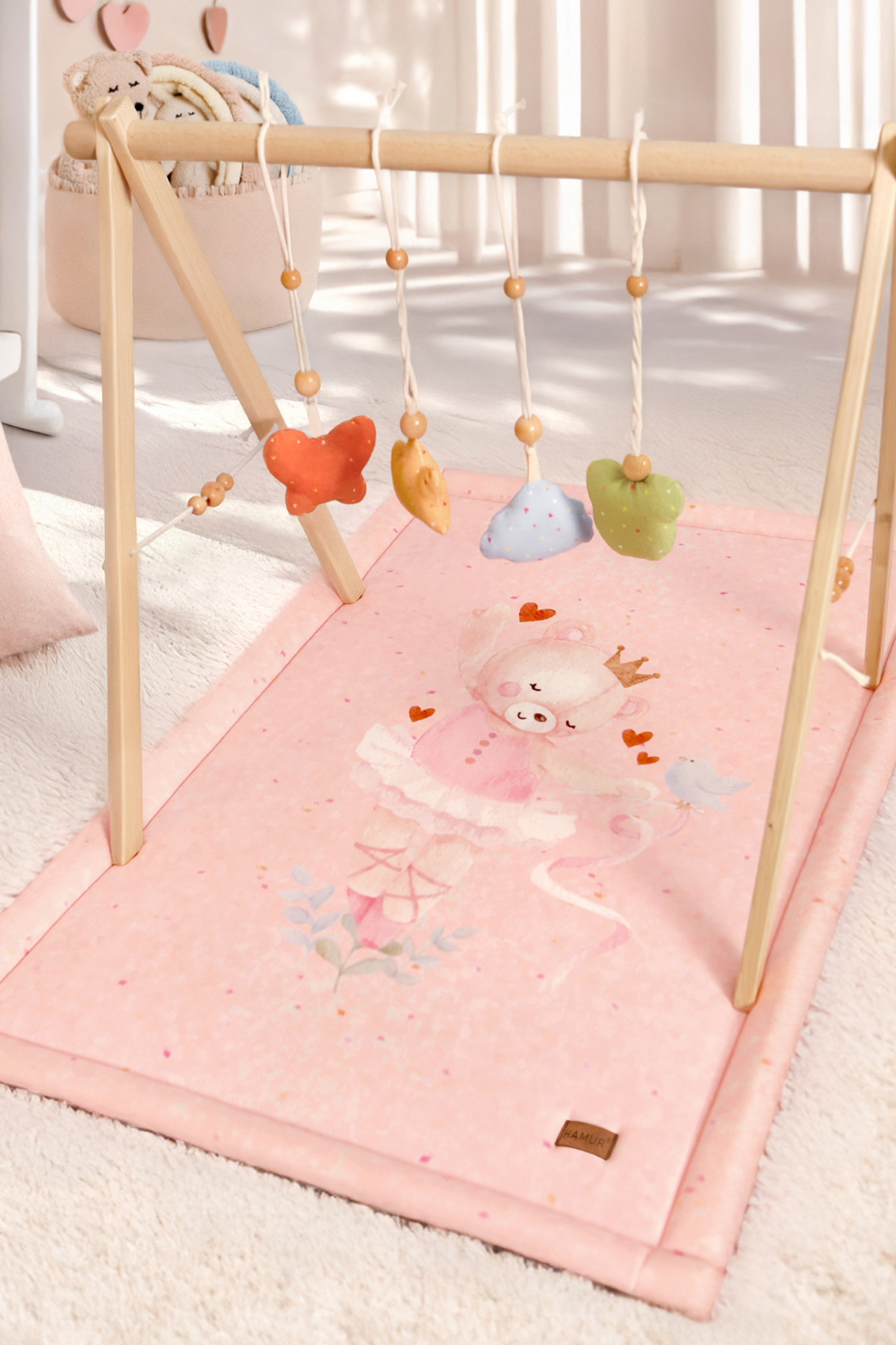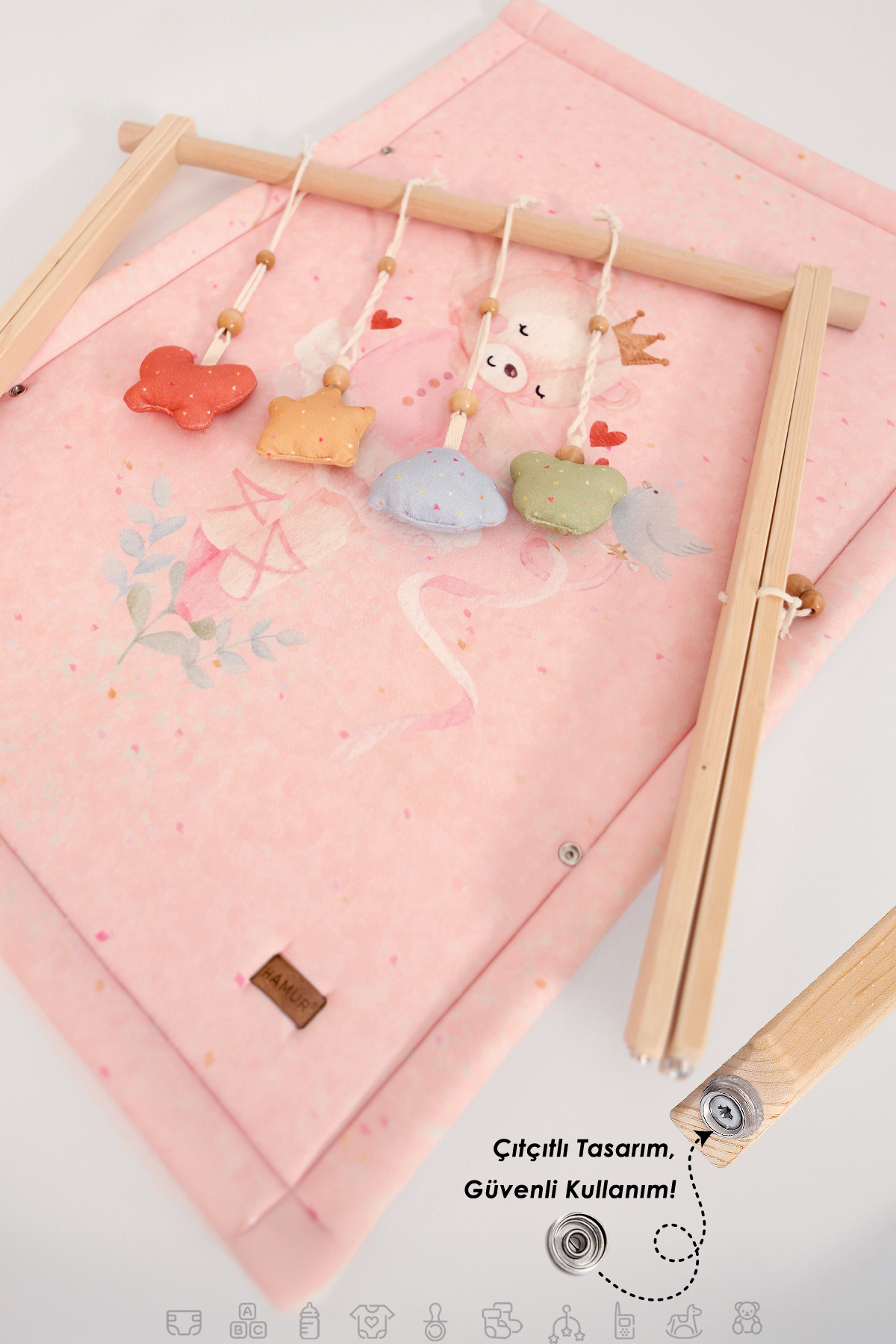 Matın üzerindeki peluş figürler bebeğinizin dikkatini çekerken, renkli tasarımı görsel algısını zenginleştirir.