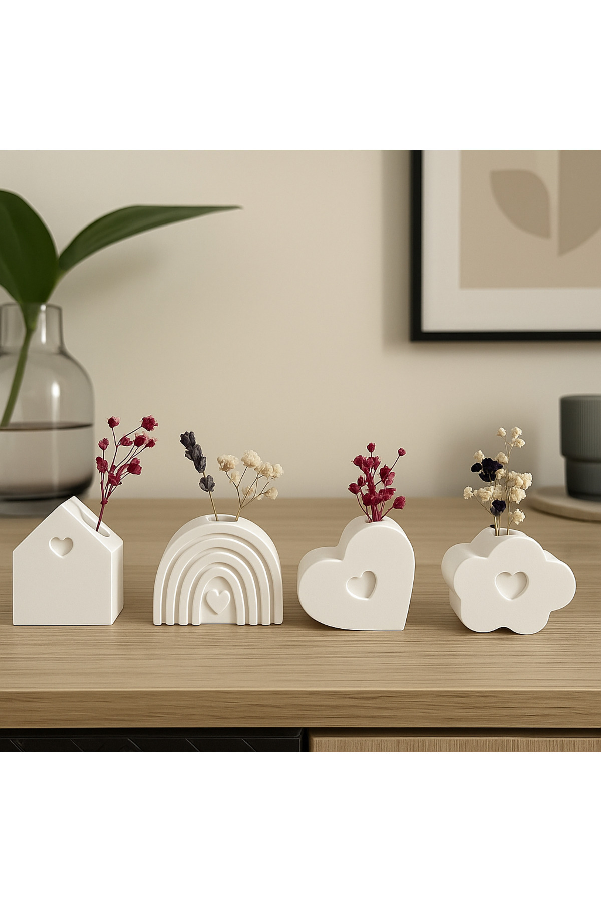 4’lü Dekoratif Kalp, Ev, Bulut ve Gökkuşağı Figürlü Mini Vazo Seti