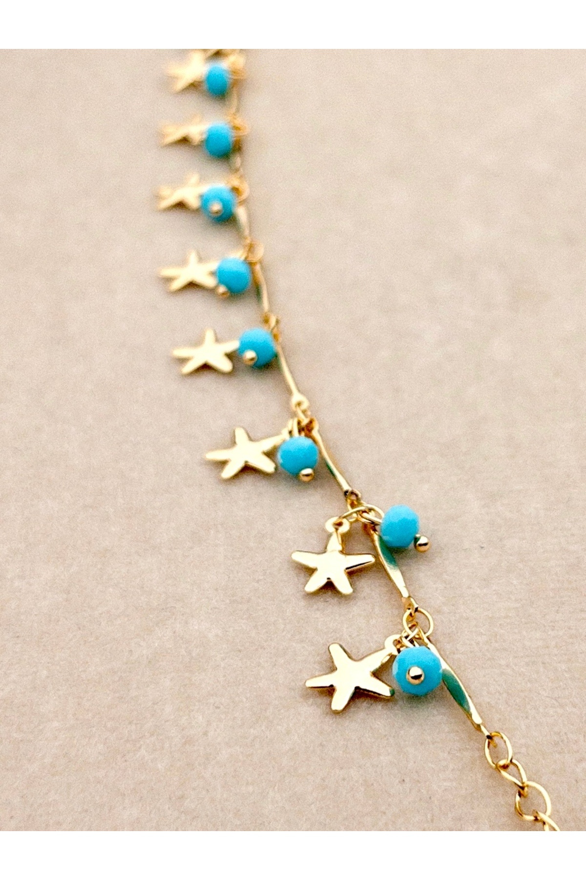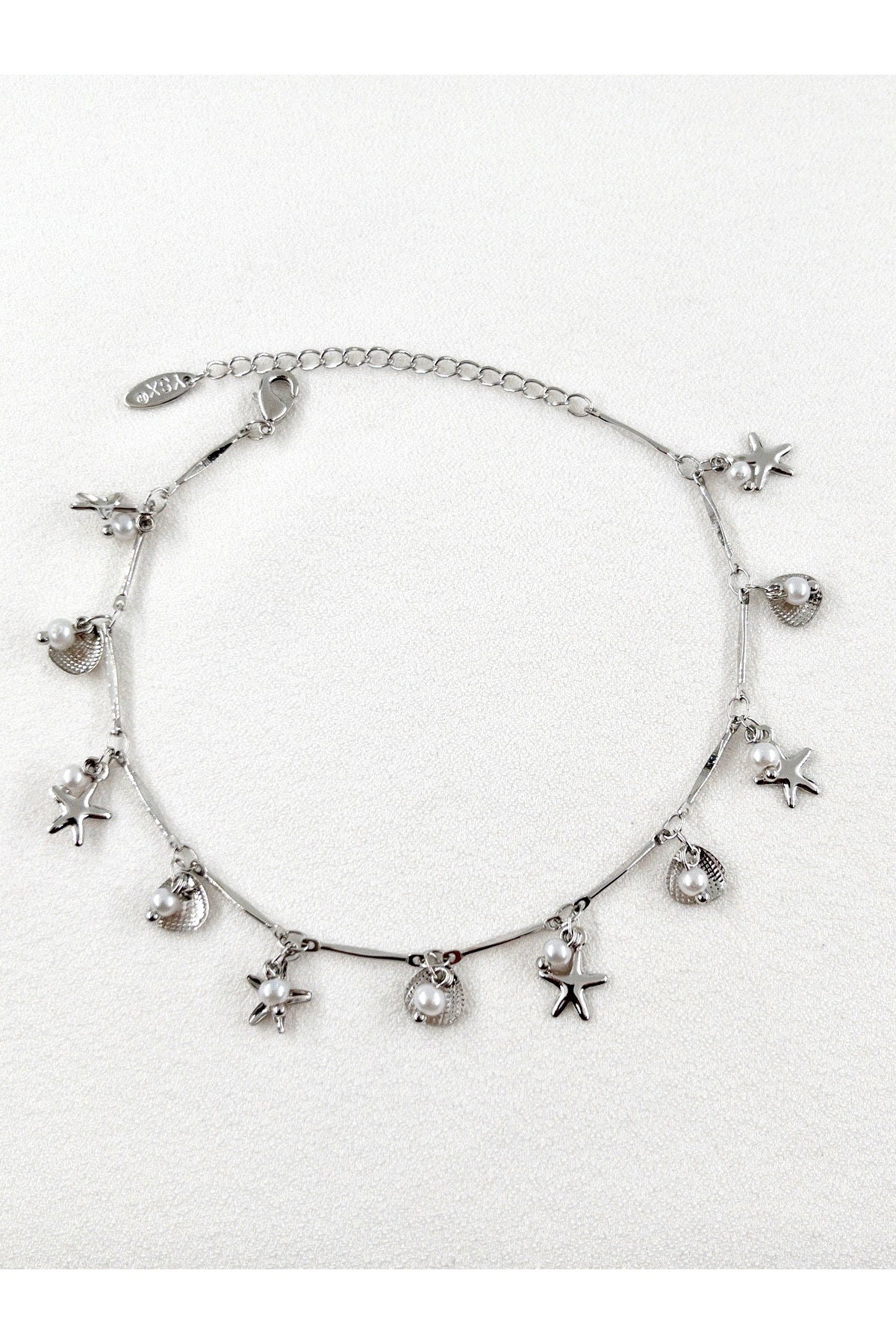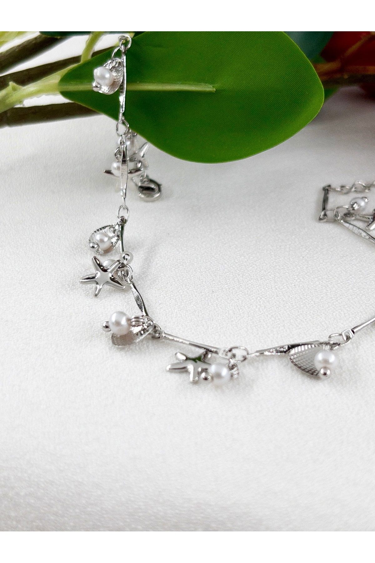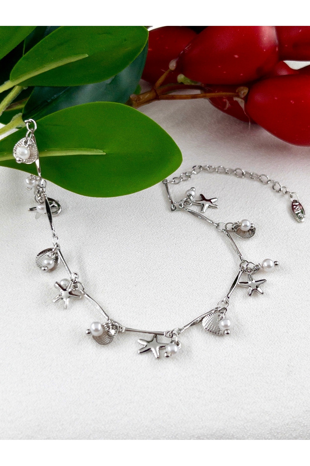 - Deniz Yıldızı ve İstiridye figürleriyle süslenmiş, zarif tasarımıyla dikkat çeken incili çelik halhal.