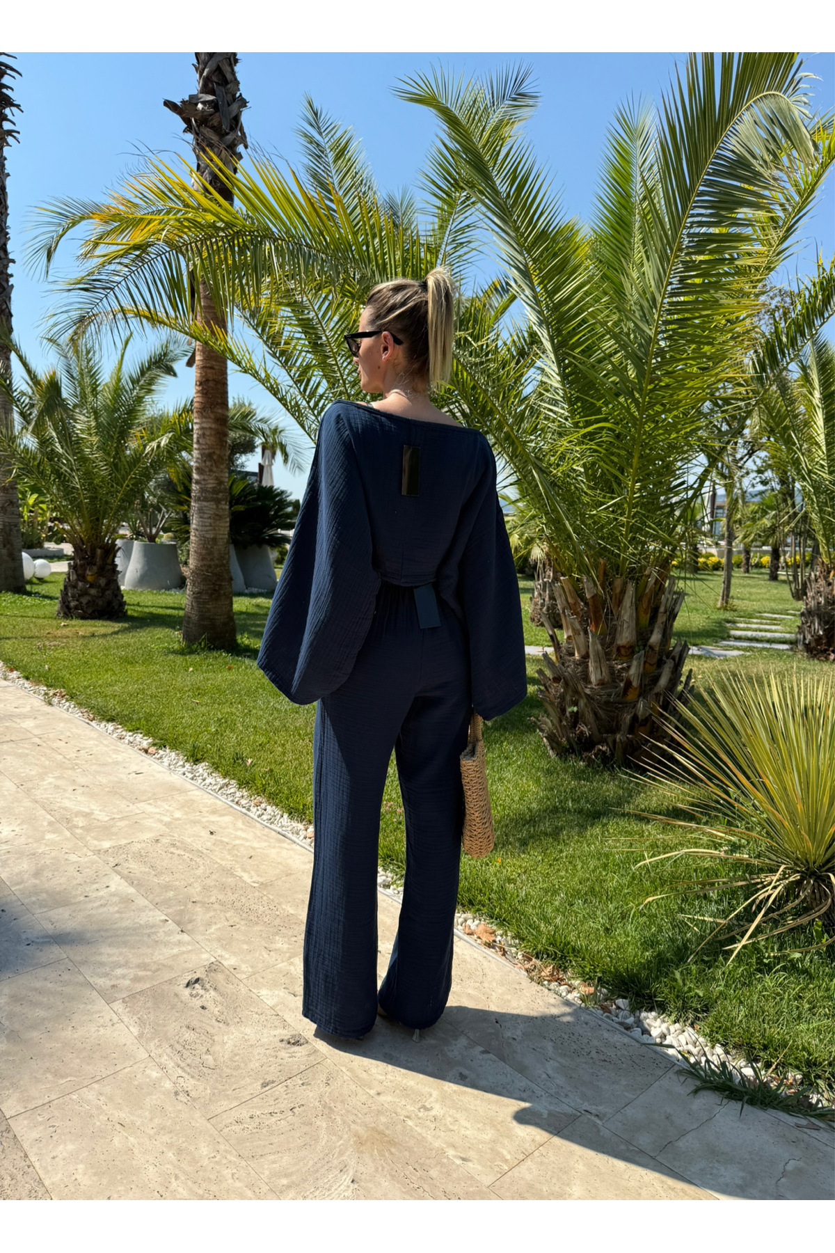- Çift cepli pantolon kısmı hem fonksiyonel hem de estetik bir detay olarak öne çıkarken, uzun kol boyu serin yaz akşamları için ideal korumayı sunar.
