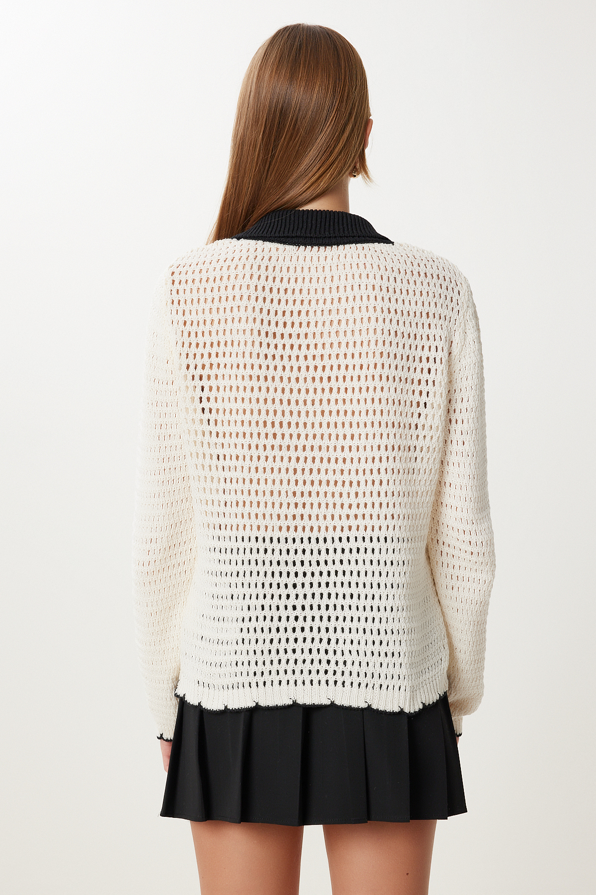 • Polo yaka, esnek yapılı, düşük omuzlu, bağlama detaylı, kontrast renkli triko hırka