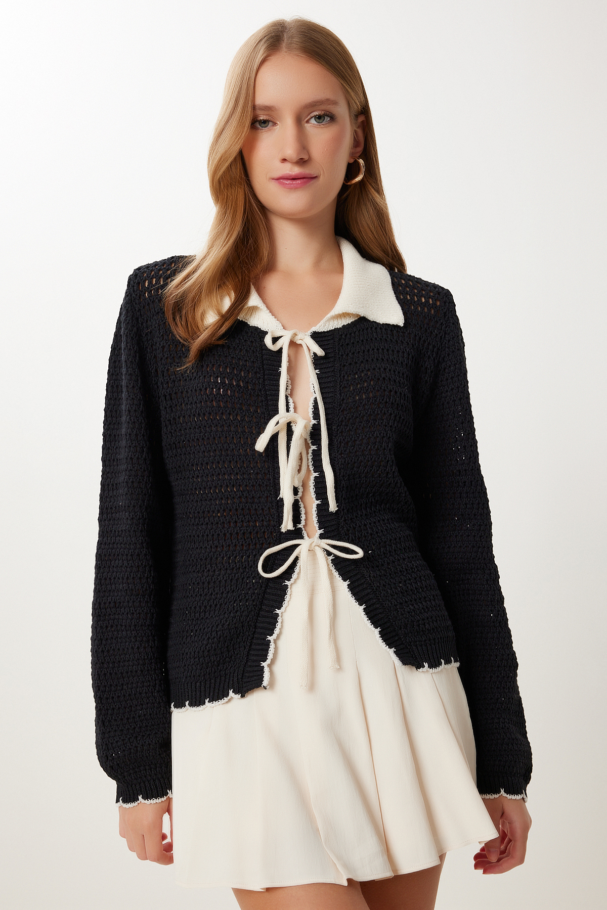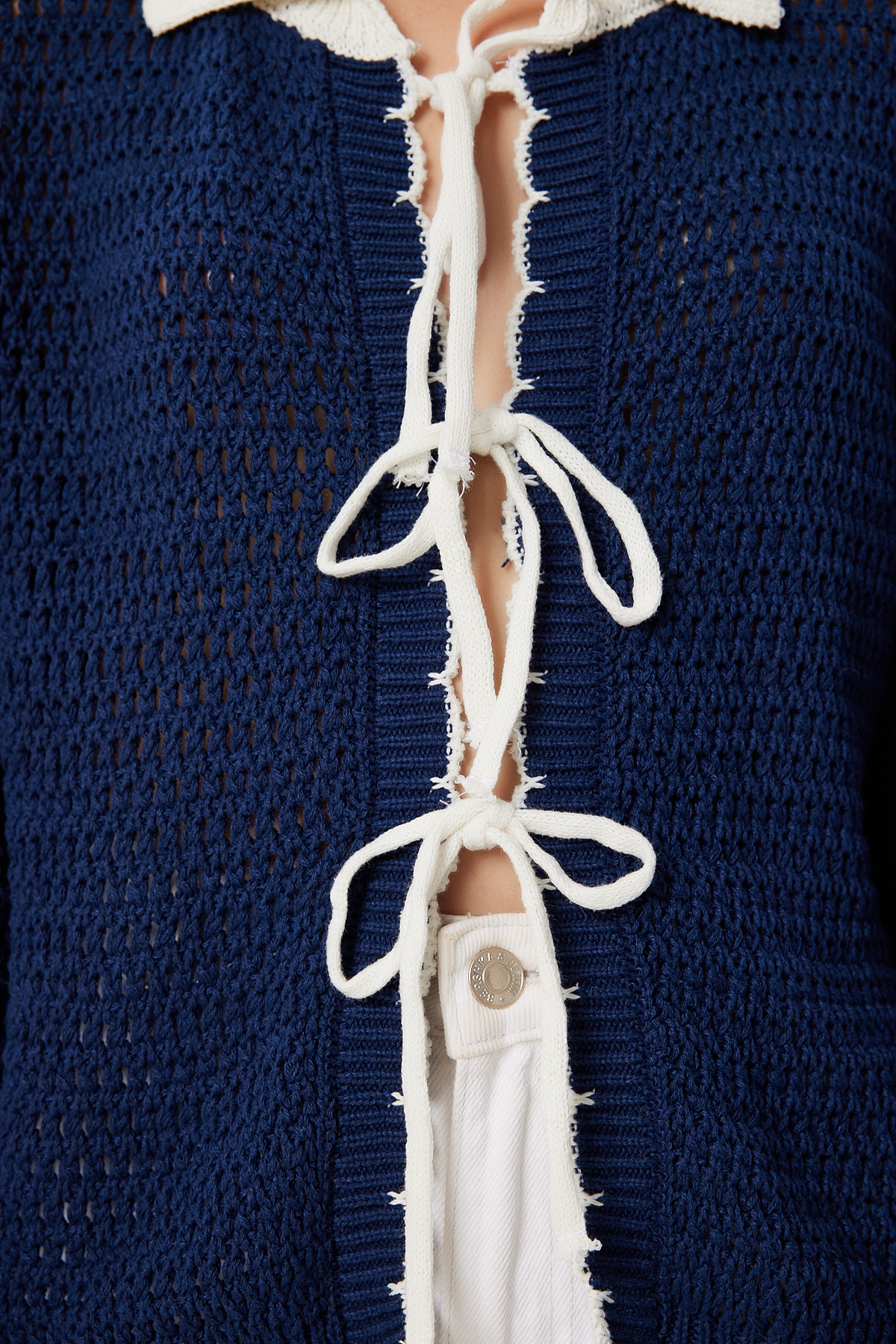 Polo yaka, esnek yapılı, düşük omuzlu, bağlama detaylı, kontrast renkli triko hırka