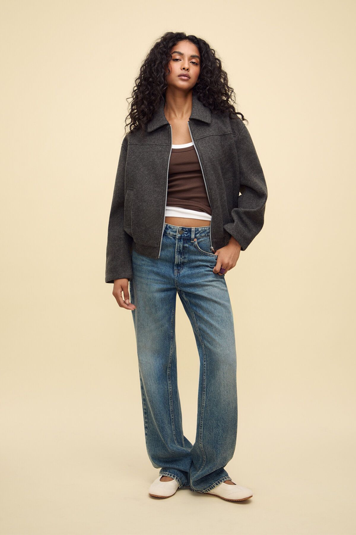 Yakalı ve uzun kollu, kısa bomber ceket.