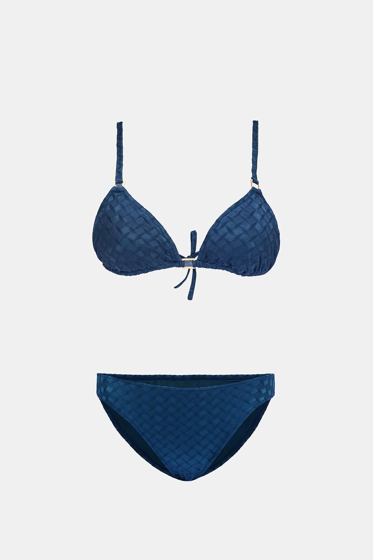 Petrol mavisi rengiyle dikkat çeken bu takım, plaj stilinize sofistike bir dokunuş katar.