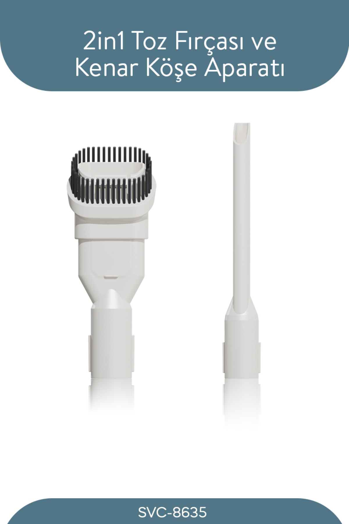 yerleri kolayca temizleme özelliği • Aparatlar : 2 in 1 toz fırçası, kenar/köşe başlık aparatı, harici şarj edilebilen batarya, adaptör ve duvar askı aparatı