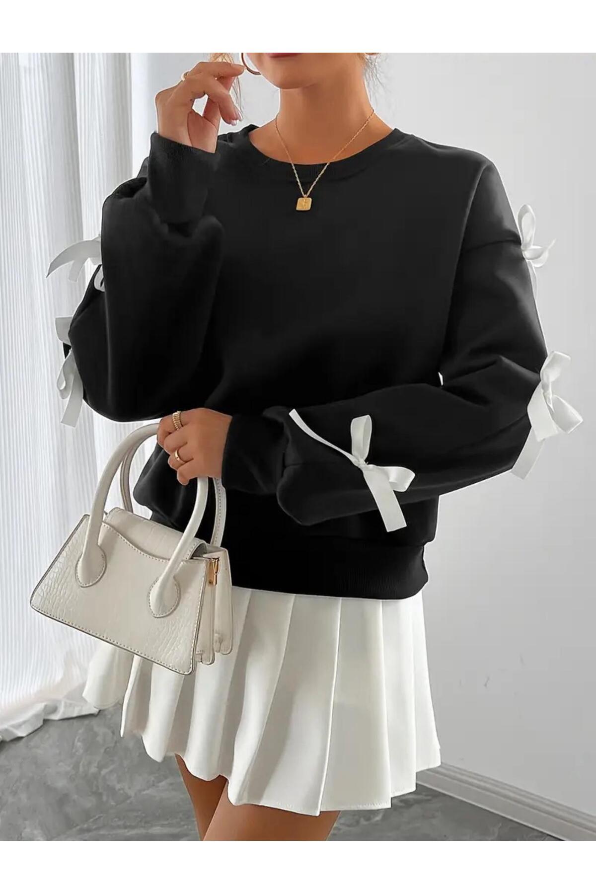 Yumuşacık dokusu ve zarif detaylarıyla öne çıkan bu sweatshirt, kollarındaki kurdele süslemeleriyle feminen ve şık bir dokunuş sunar.