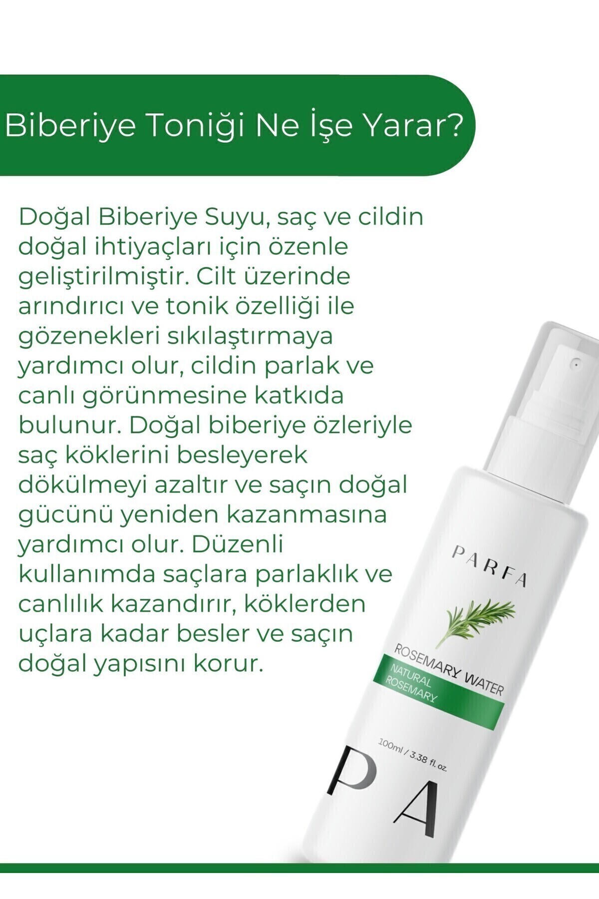 %100 Doğal Saf Biberiye Suyu – 100 ml %100 doğal içerikli saf biberiye suyu, hiçbir katkı maddesi, koruyucu veya esans içermeyen, soğuk distilasyon yöntemiyle elde edilmiştir.