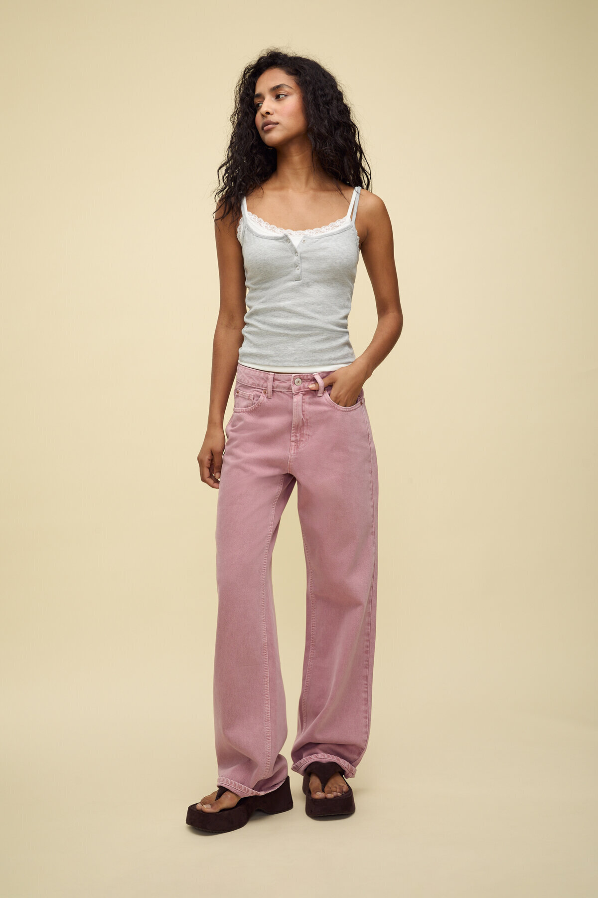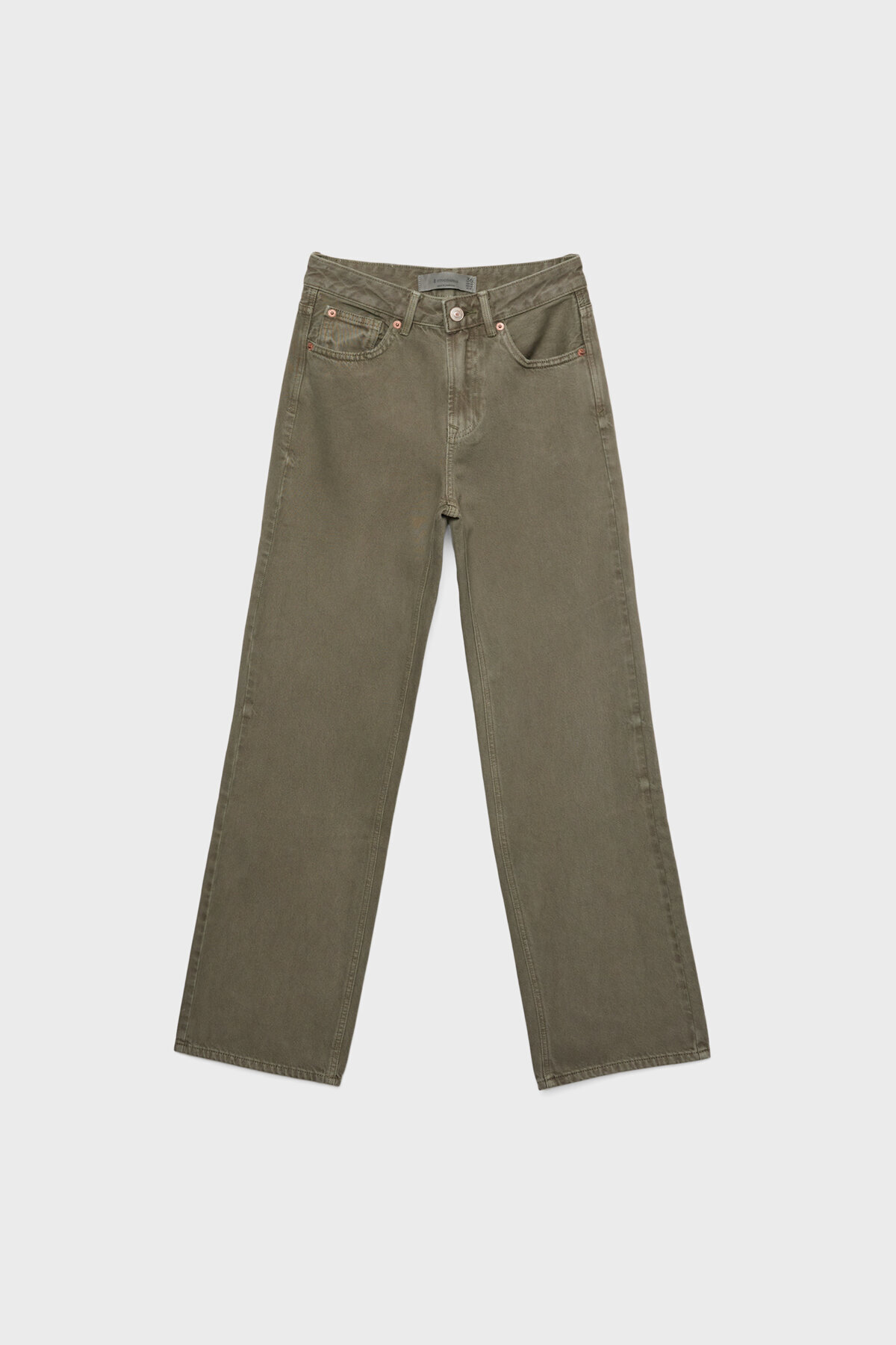 Yüksek bel, düz kesim, geniş paça, ön cepli jean pantolon.