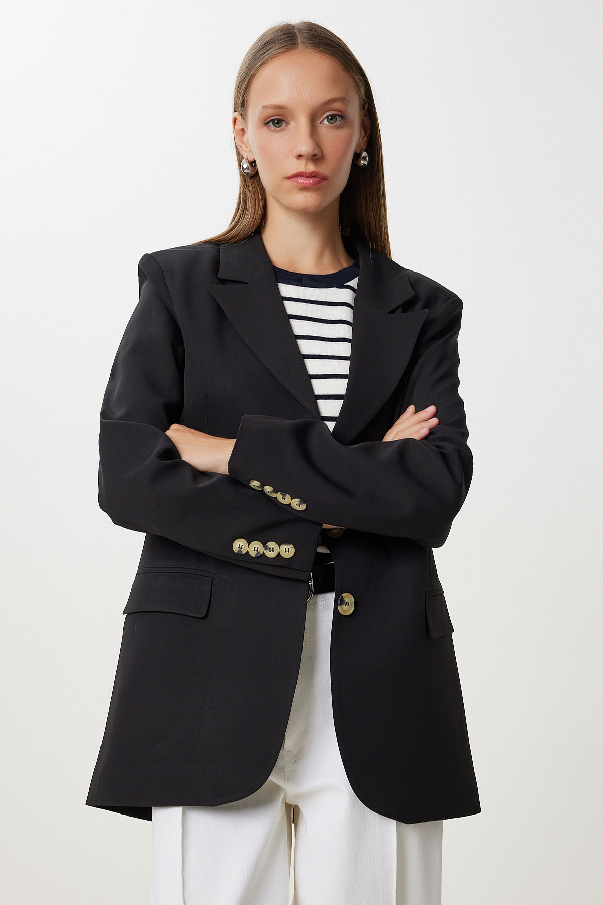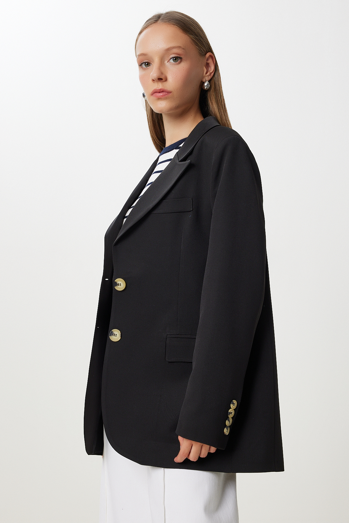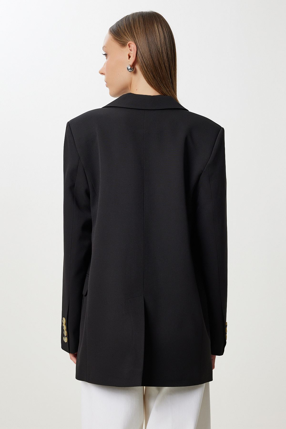 • Kruvaze yaka, düğme kapamalı, kapaklı cepli, astarlı, vatkalı, oversize dokuma ceket