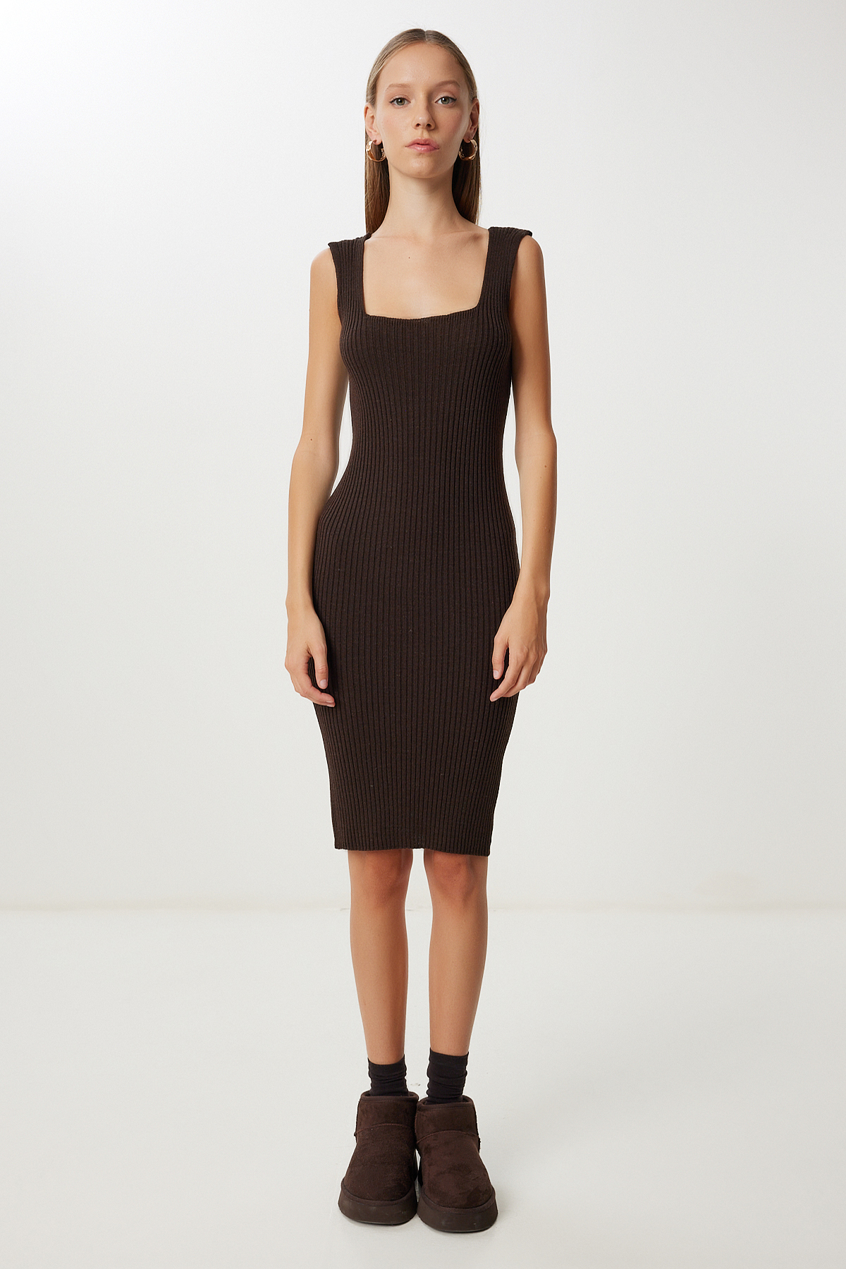 Geniş yaka, düşük omuzlu, ajurlu kazak ve kalın askılı, ayrı kullanılabilen fitilli midi elbise