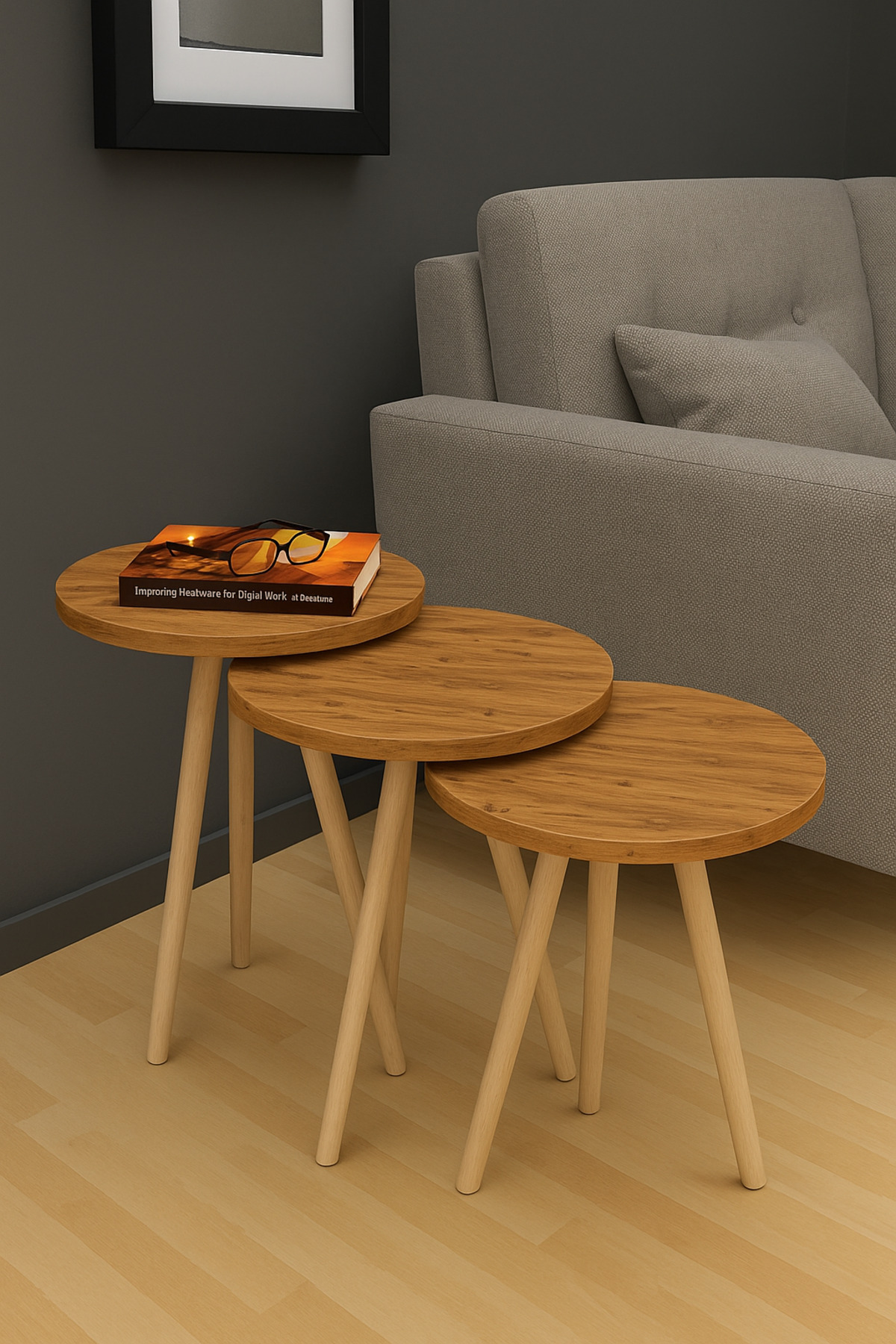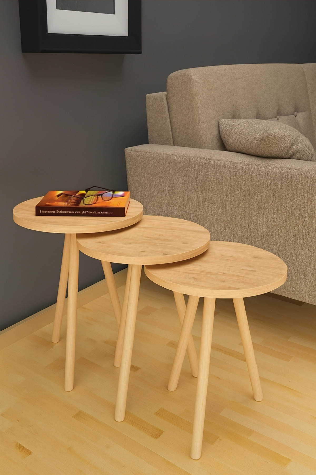 Zigon Sehpa Doğal Ahşap Ayaklı 3’lü Set Yuvarlak