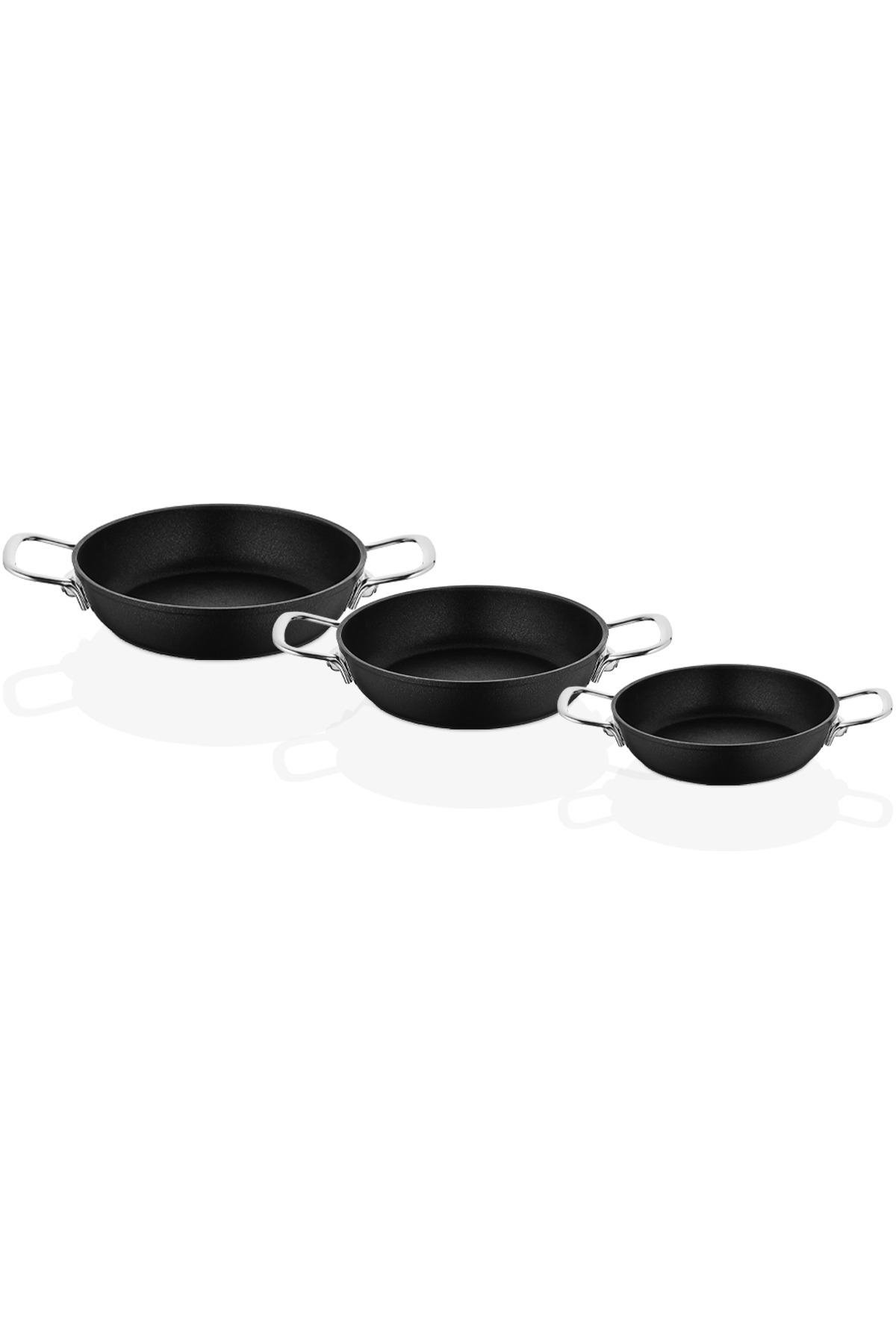 Set İçeriği: Bu çok yönlü 3 parçalık set, farklı ihtiyaçlarınıza uygun üç farklı boyutta sahan dan oluşmaktadır • 18 cm Sahan: Tek kişilik omletler, soslar veya küçük porsiyonlar için ideal.