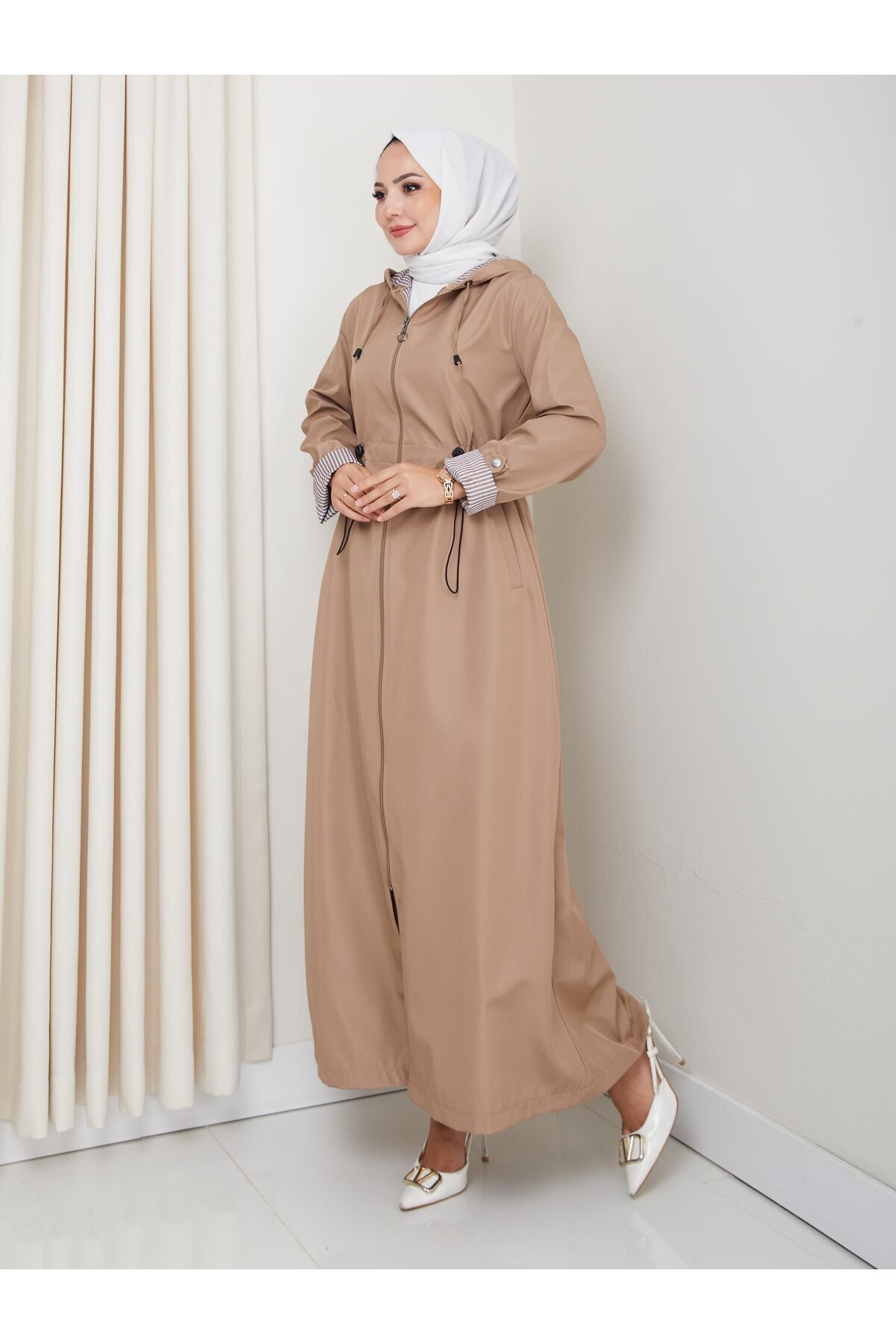 - Bej rengin zarif tonlarıyla tasarlanmış, vizon detayları ile şıklığı ön plana çıkaran kapüşonlu tasarım.