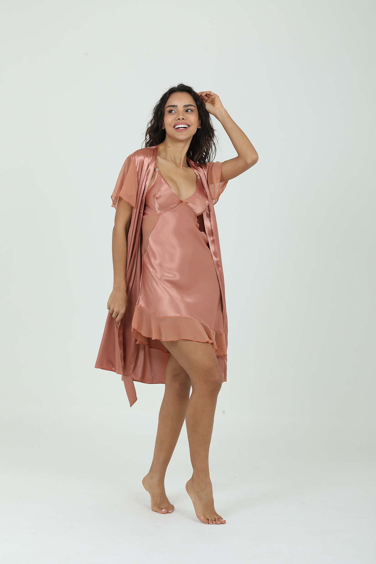 Kısa Kollu Saten Çeyizlik Gecelik Sabahlık Takımı – Romantik Stil İNCİ
