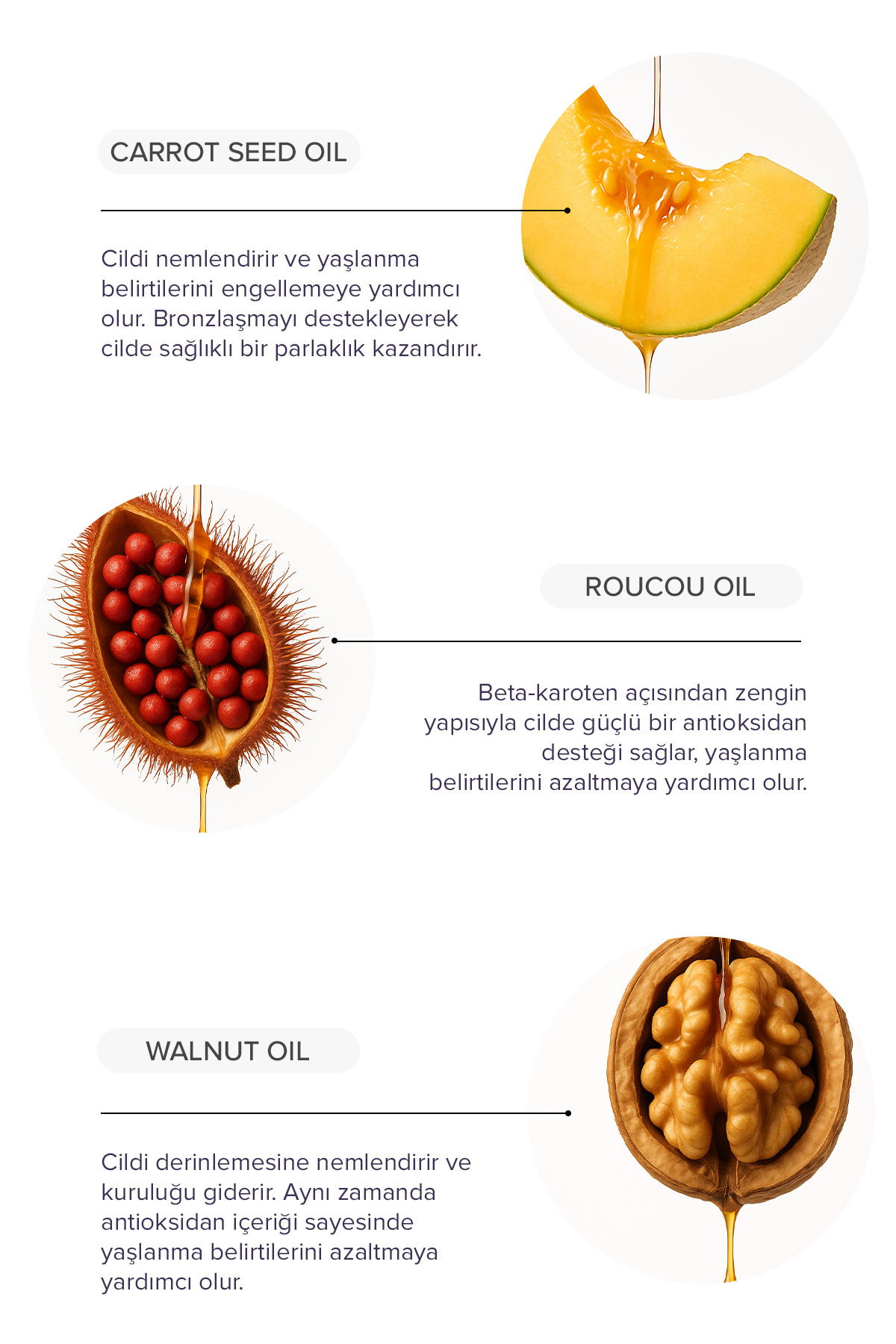Havuç yağı, beta-karoten ve bitkisel özlerle formüle edilmiş bu bronzlaştırıcı yağ, cilde sağlıklı bir ışıltı kazandırırken nem desteği sağlar.
