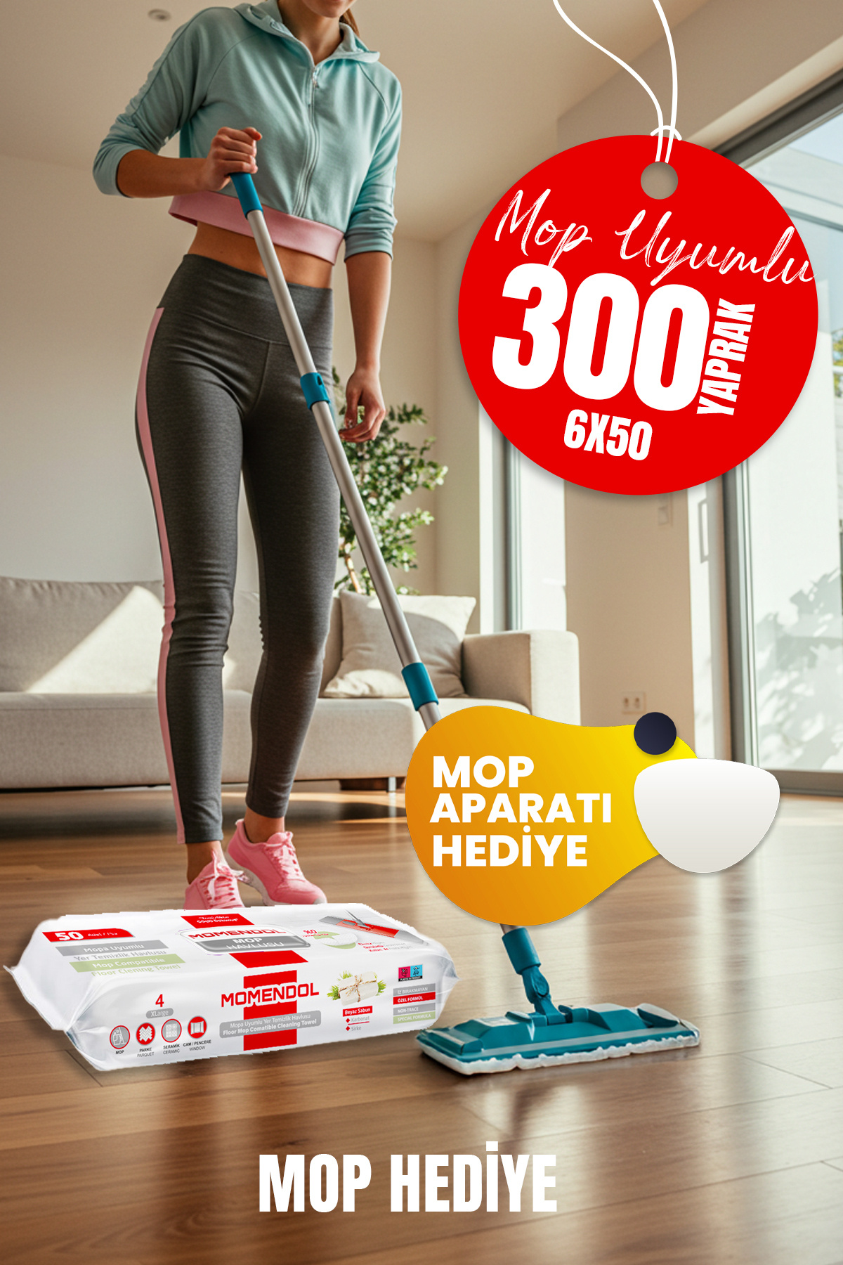 Mop Temzilik Havlusu Beyaz Sabun 6 Adet 300 Yaprak Mop Hediyeli