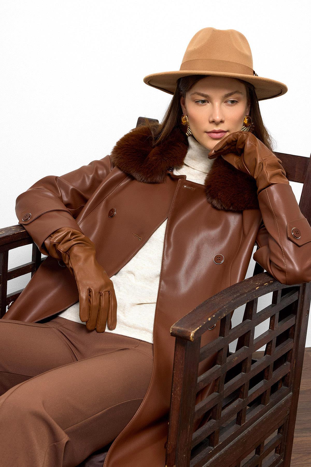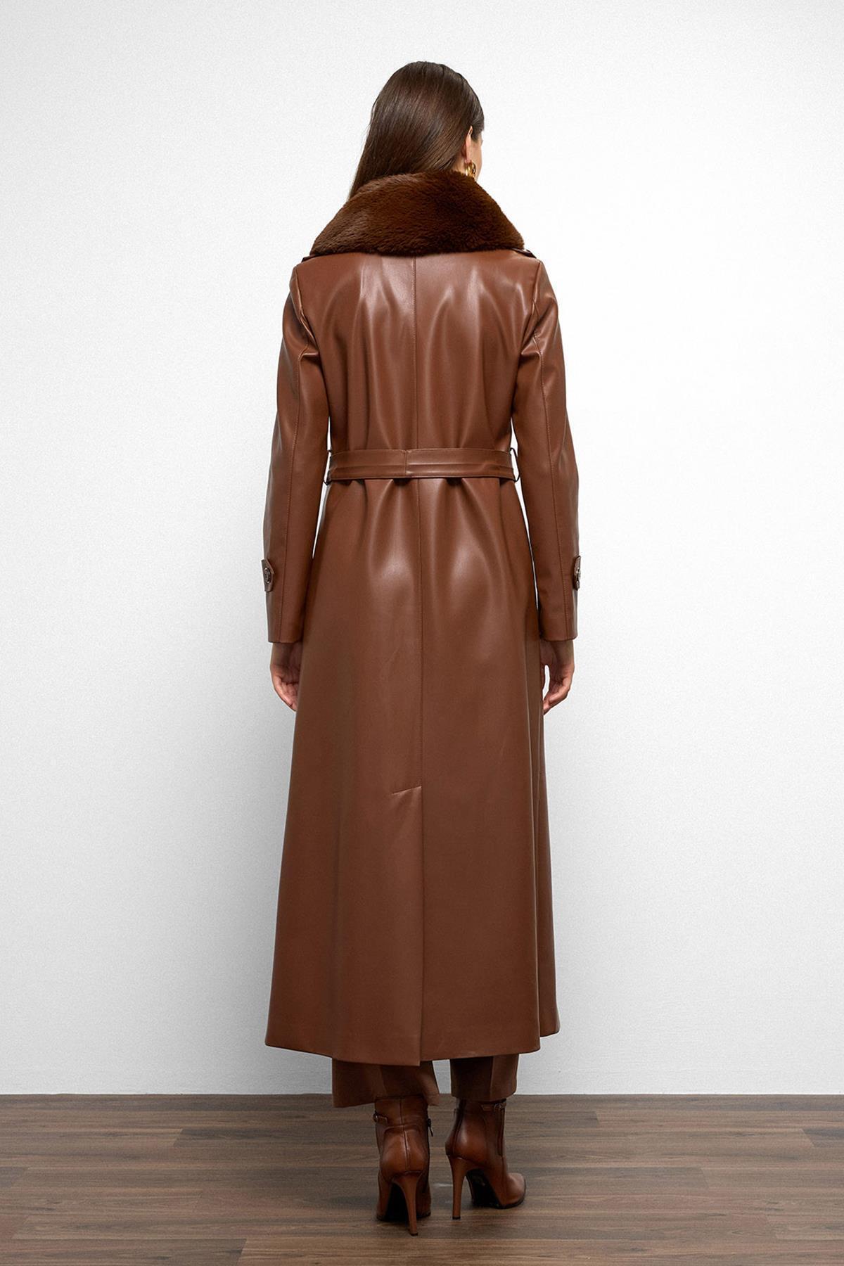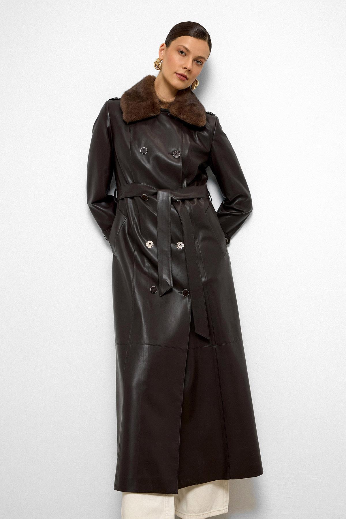 Yakası Çıkabilen Kürklü Kruvaze Deri Görünümlü Uzun Trençkot TABA 6676