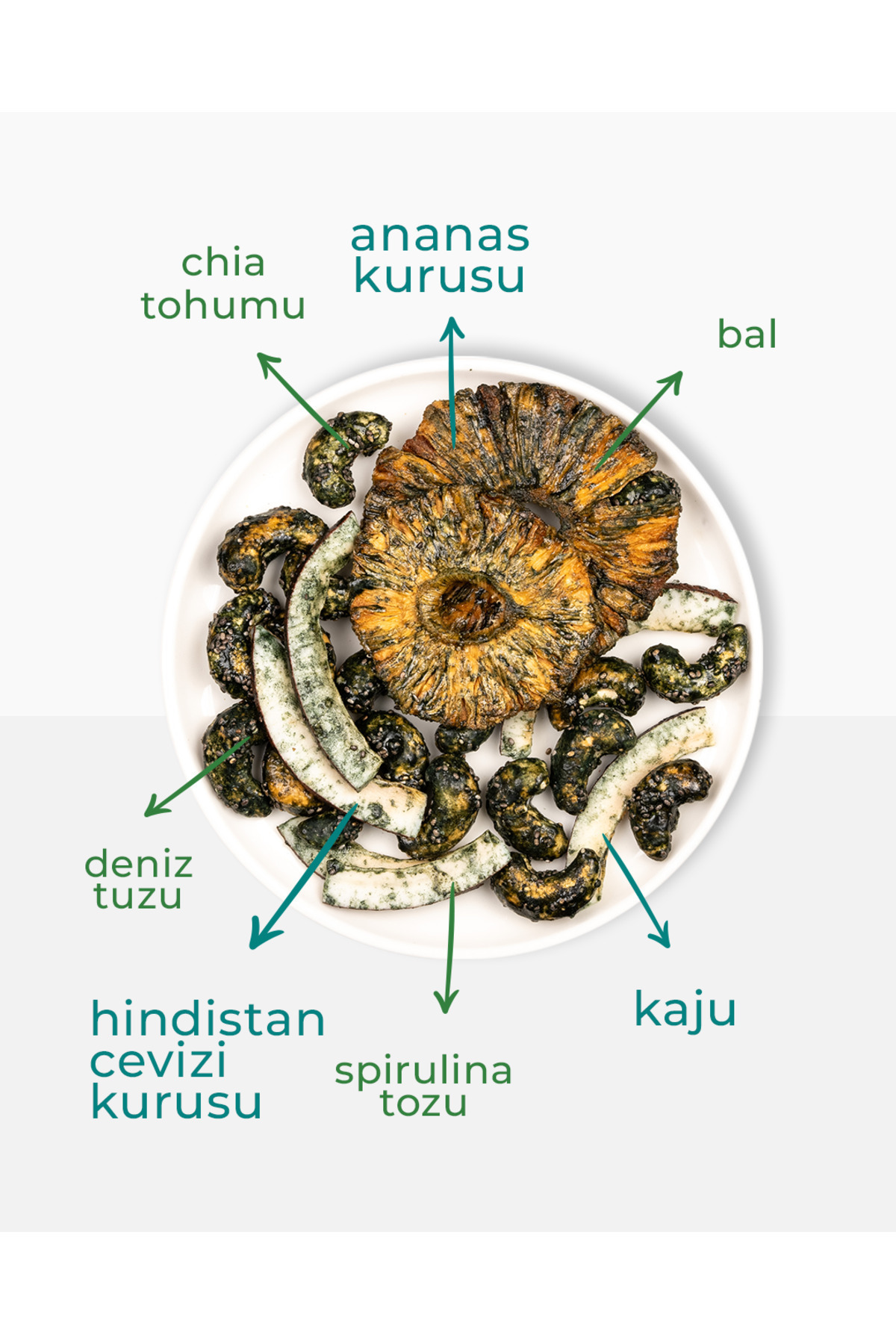 Dominicana Sağlıklı Atıştırmalık İçindekiler: Kaju, ananas kurusu, hindistan cevizi kurusu, bal, spirulina tozu, chia tohumu, deniz tuzu.