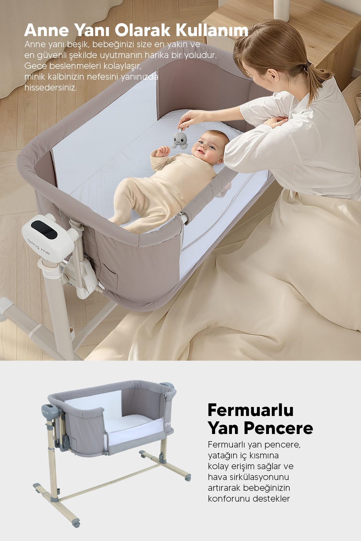 sensörlü, otomatik sallanabilir sistemi ile bebeğinizi nazikçe uyutur. Anne yanı tasarım, oyun parkı ve portbebe özelliği sayesinde konfor ve güveni bir arada sunar.