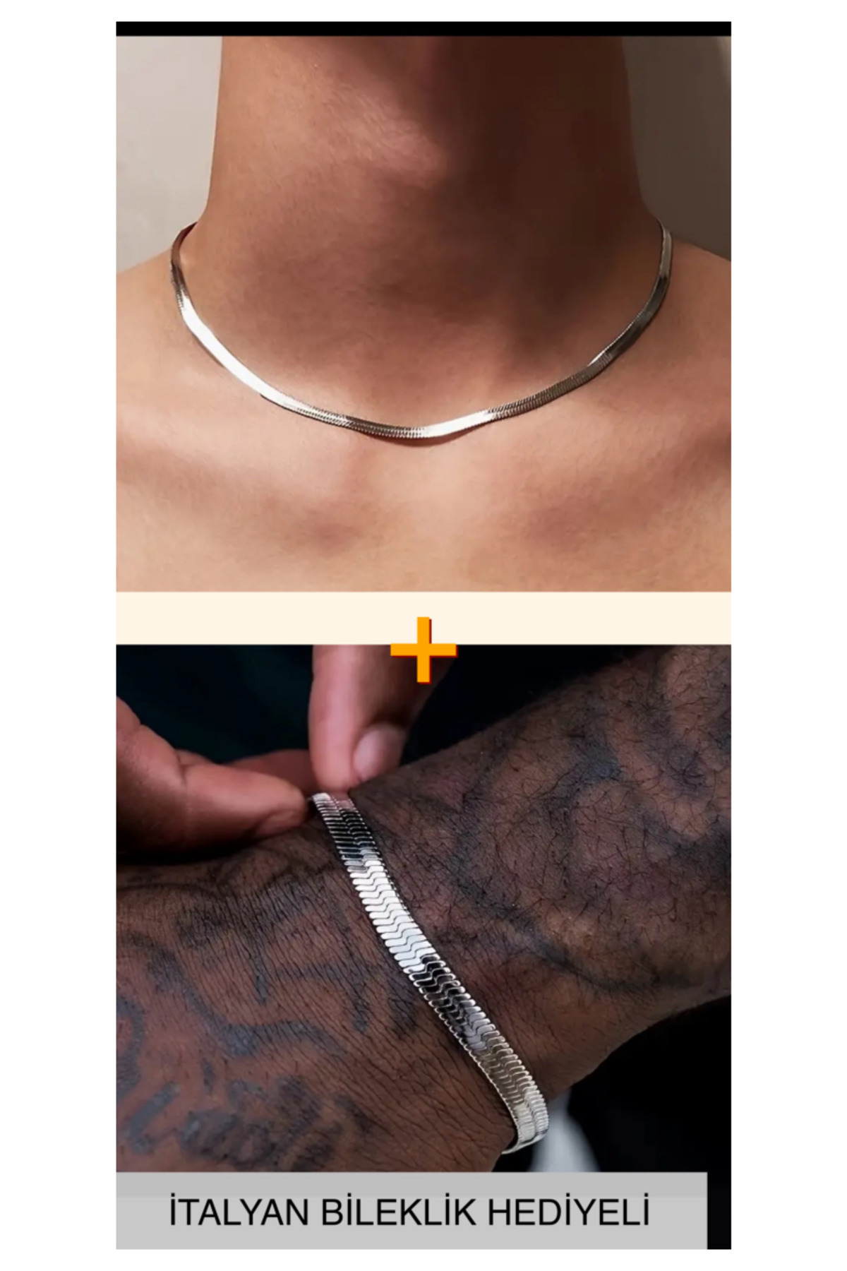 %100 ÇELİK KARARMAZ GÜMÜŞ RENK UNİSEX 4 MM İTALYAN YASSI YILAN KOLYE 4 MM İTALYAN BİLEKLİK HEDİYELİ