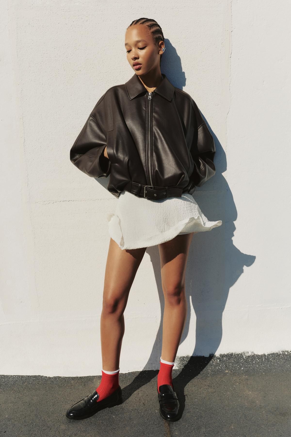 Balon silüetli, suni deri kumaşından bomber ceket, fermuar kapamalı, etek ucu tokalı kemerli, uzun kollu ve cepli.