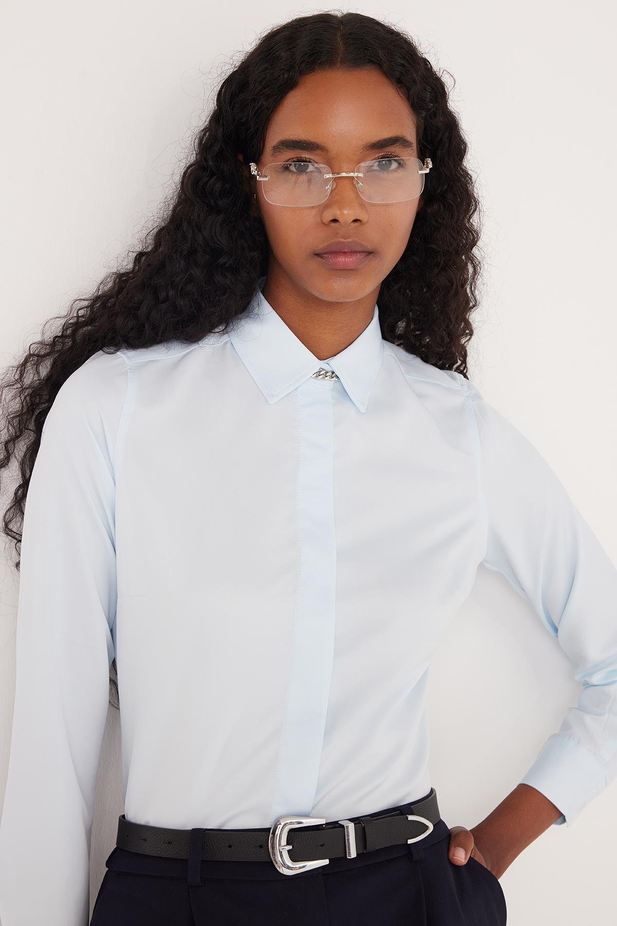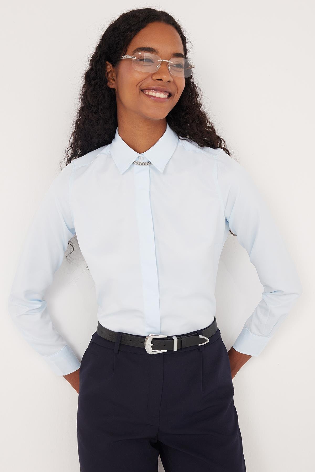 Kadın Slim Fit Dar Kesim Vucüda Oturan Uzun Kollu Gizli Düğme Detaylı Mavi Basic Gömlek