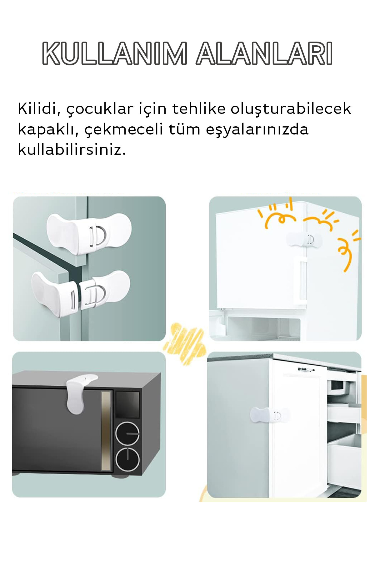 Aynı zamanda çocuklarınızın ulaşmaması gereken tehlikeli nesnelere karşı, dolabınıza yapıştırarak engel olabilirsiniz.