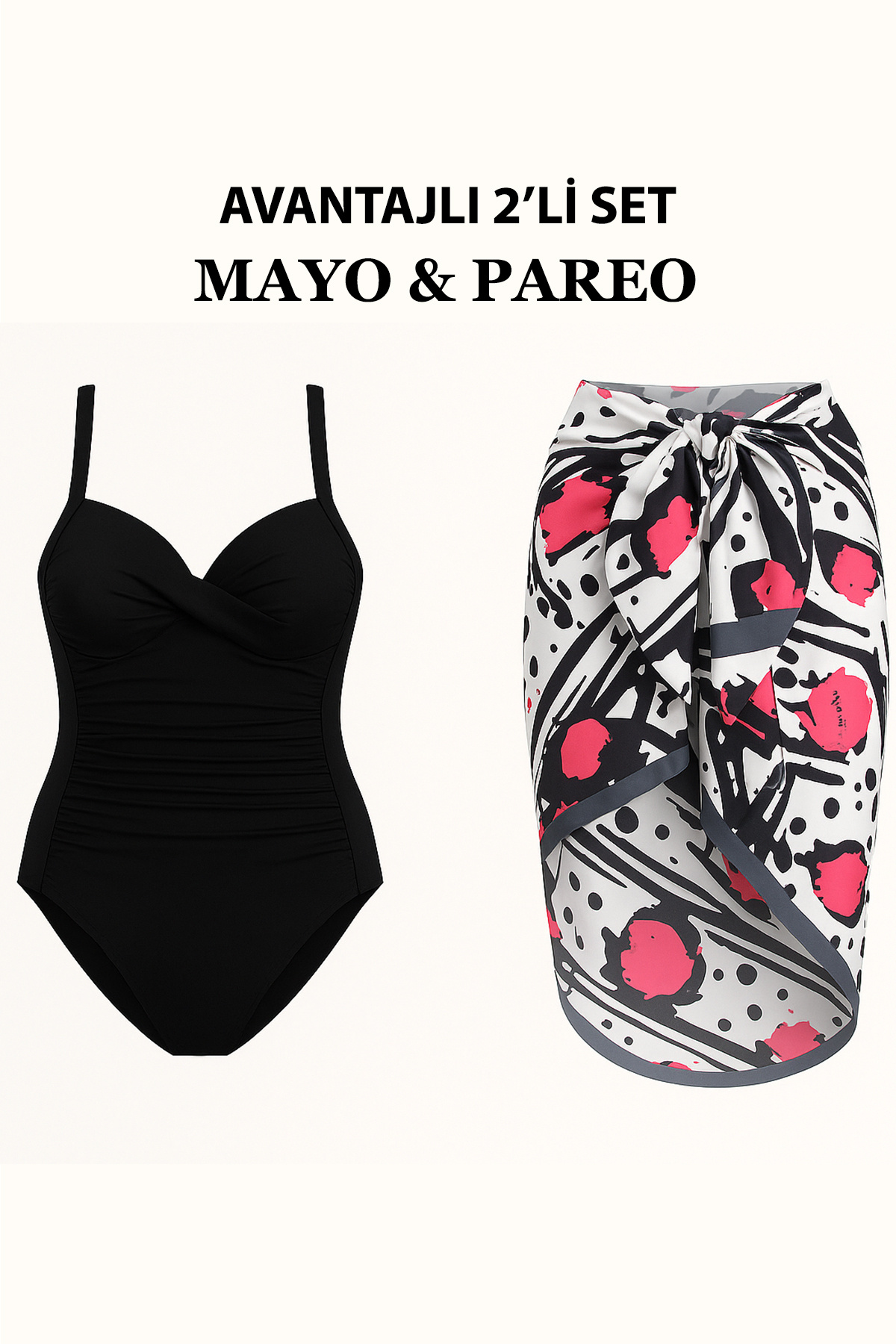 Fransız Esintili Toparlayıcı Drapeli Mayo Pareo 2li Set Ayarlanabilir Askılı,Şık Ve Incelten Etkili