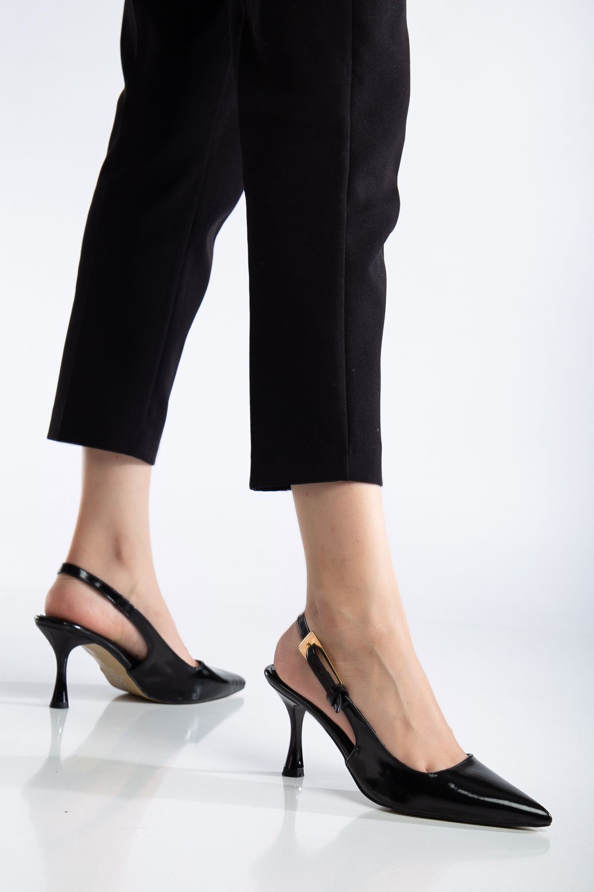 - İnce topuklu yapısıyla zarif duruşunu korurken, rugan malzemeden üretilmiş saya materyali dayanıklılık ve estetiği bir arada sunar.
