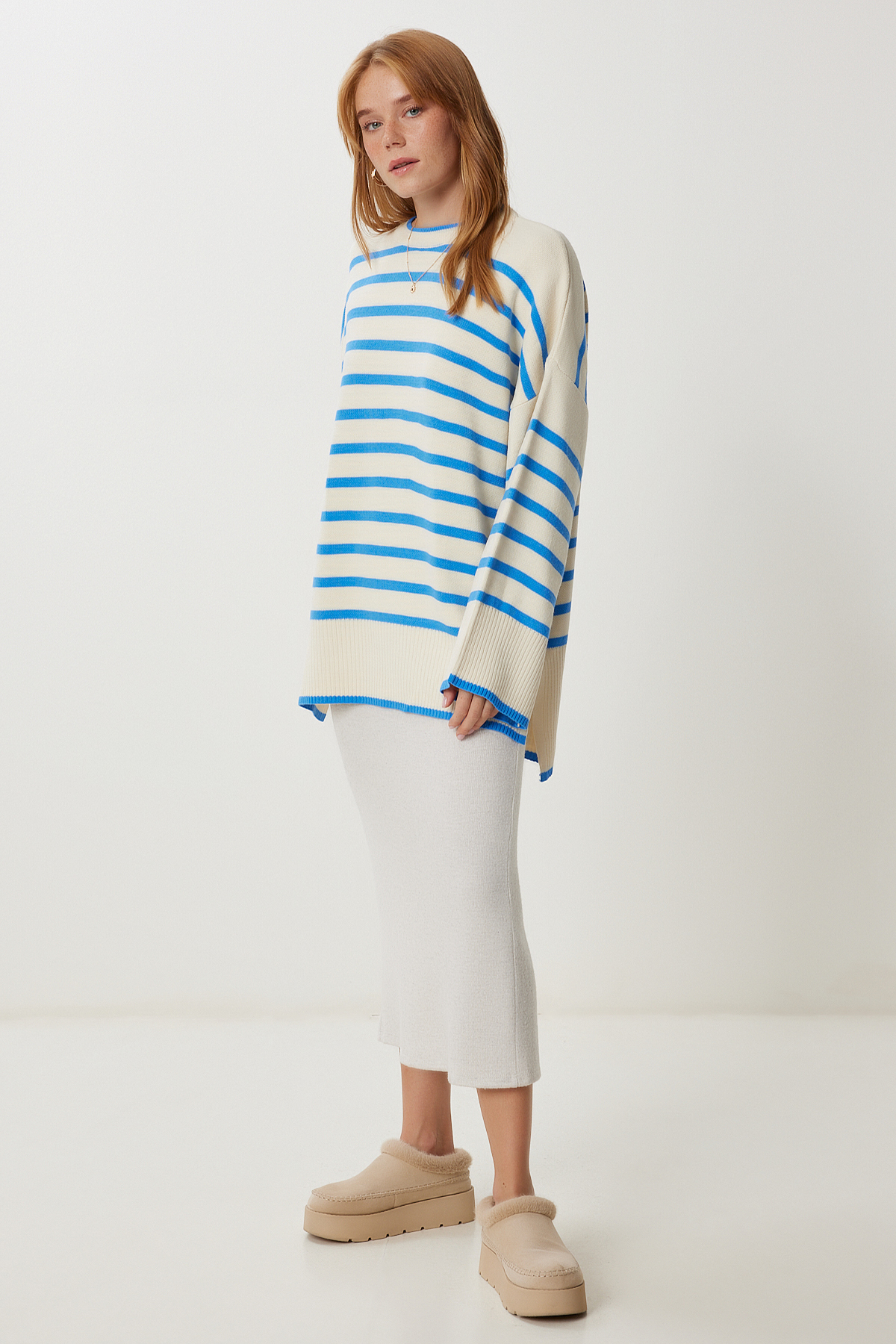 Bisiklet yaka, düşük omuzlu, esnek yapılı, yandan yırtmaçlı, çizgili oversize triko kazak