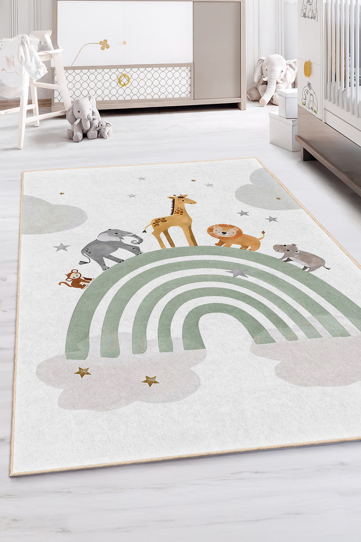 Çocuk odası için tasarlanmış bu dikdörtgen halı, serin tonlarda yeşil, doğal bej ve pastel gri renk kombinasyonuna sahiptir.