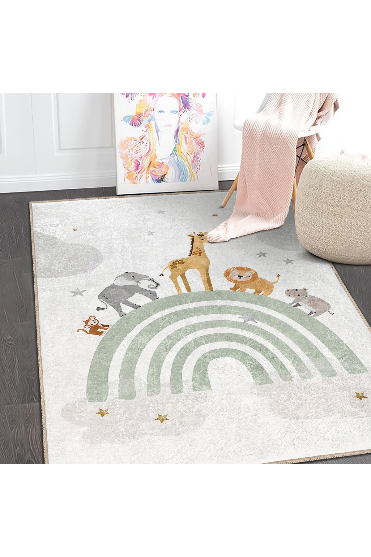 Çocuk odası için mükemmel bir seçim olan bu halı, canlı renkli hayvan figürleriyle bezenmiştir.