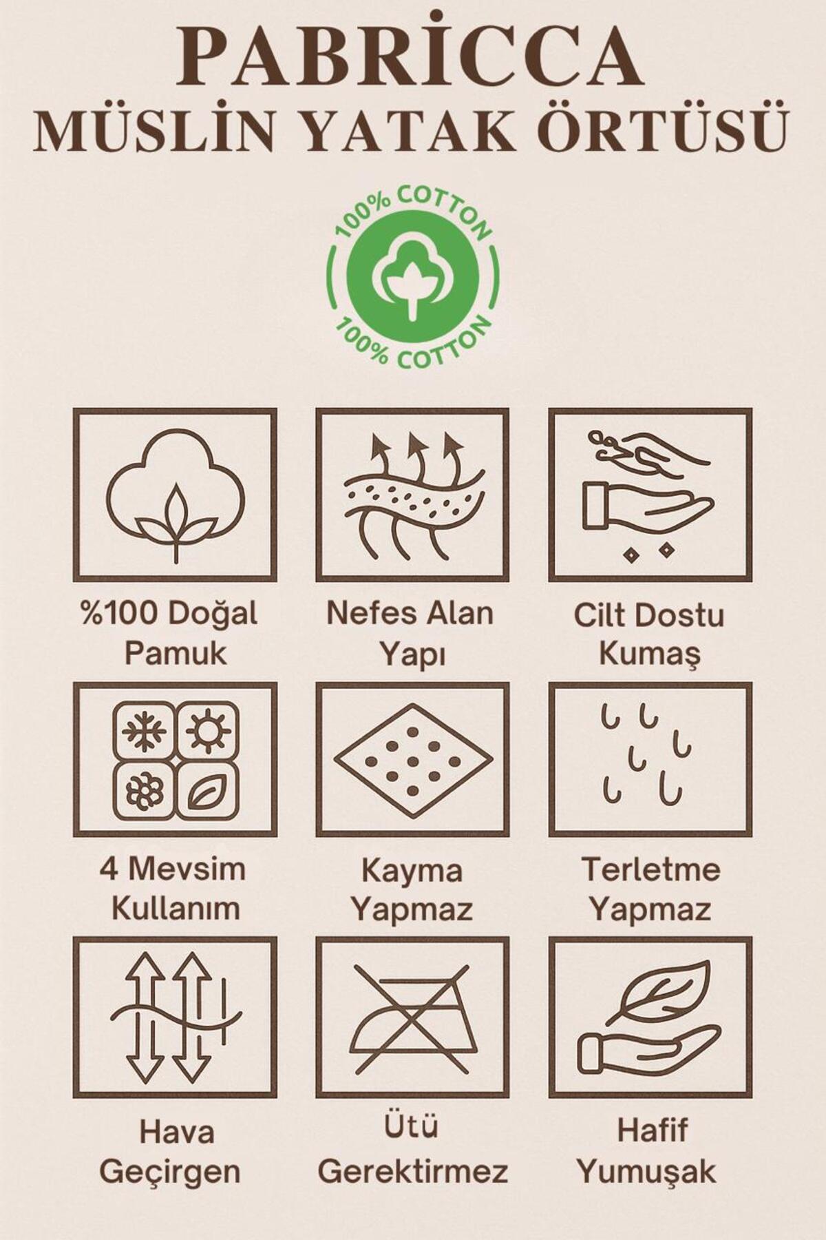 0°C’de hassas yıkama yapınız. Çamaşır suyu, optik deterjan ve yumuşatıcı kullanmayınız. Düşük devirde sıkınız. Kurutma makinesi kullanmayınız, sererek kurutun. Düşük ısıda ütüleyiniz. Direkt güneş ışığından koruyunuz. Müslin kumaş yıkandıkça yumuşar ve doğal dokusunu kazanır.