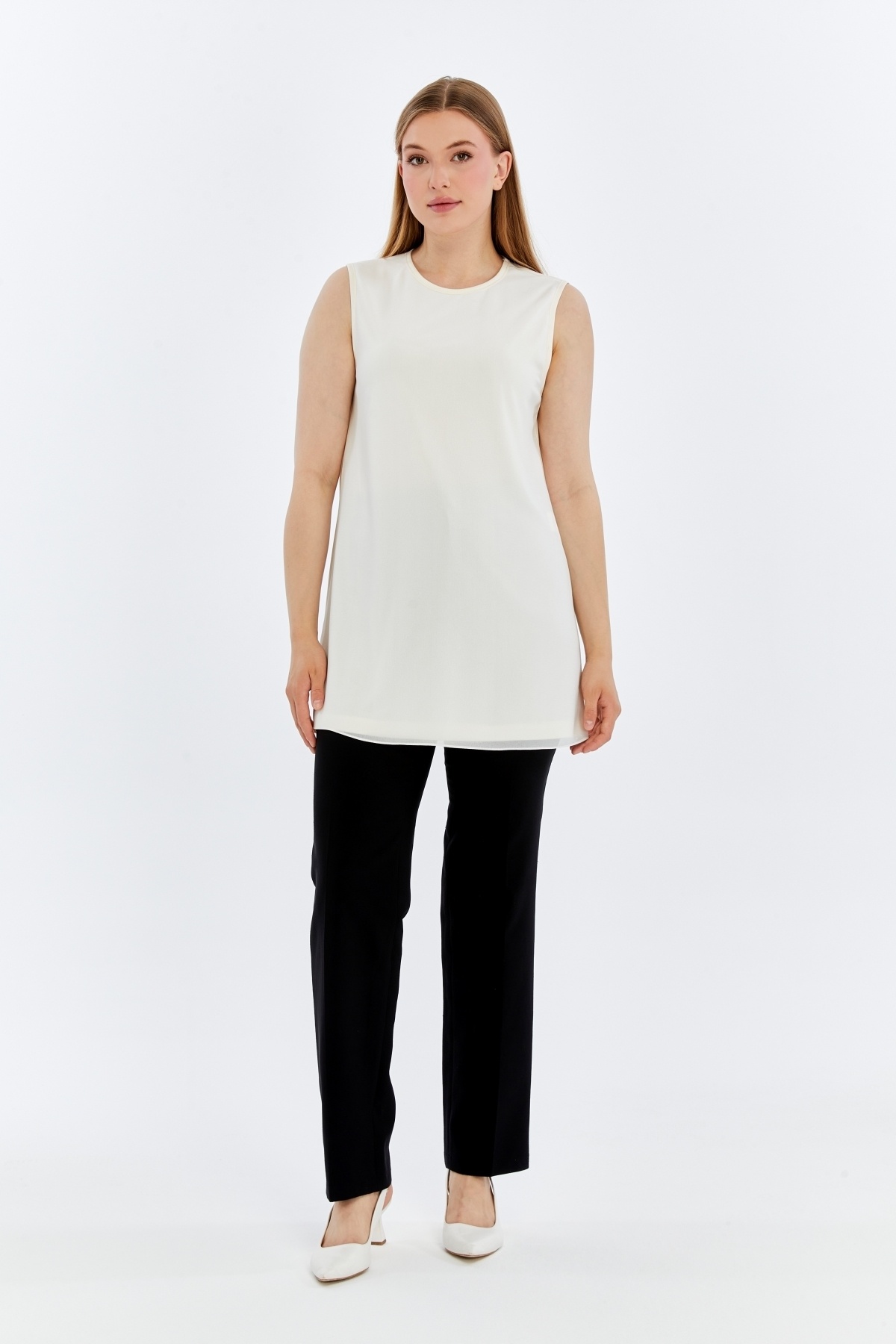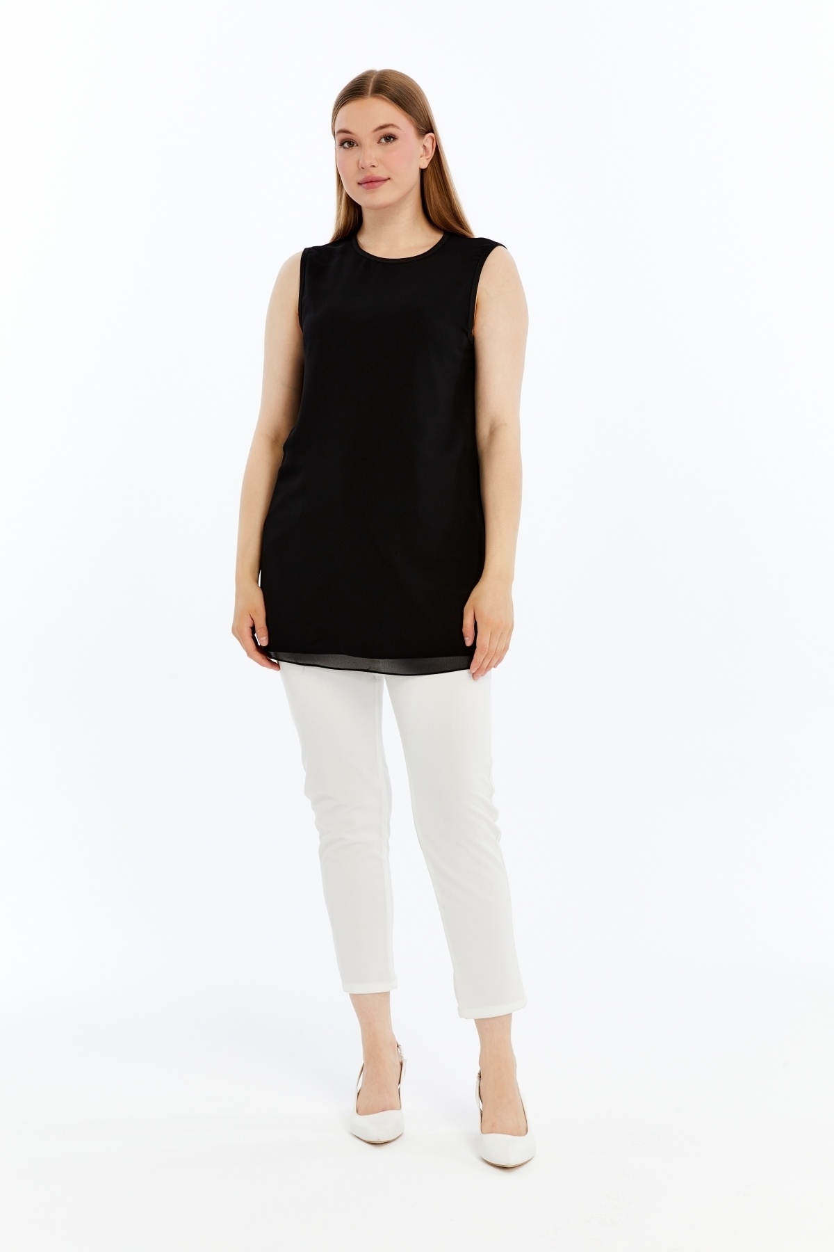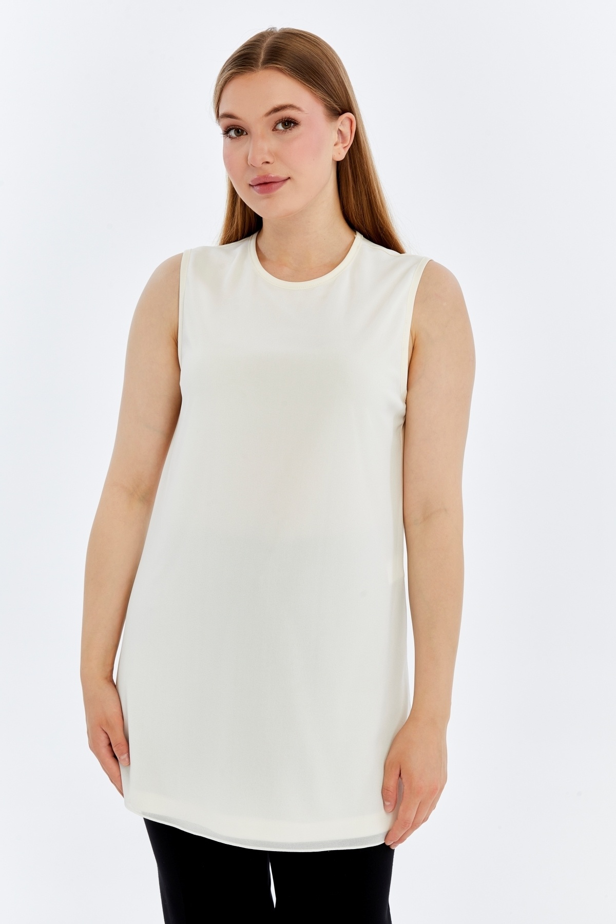 - Zarif şifon kaplaması ile tasarlanmış, sıfır yaka ve kolsuz yapısıyla rahat bir kullanım sunar.