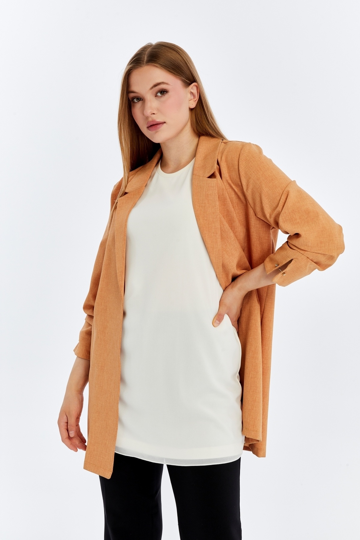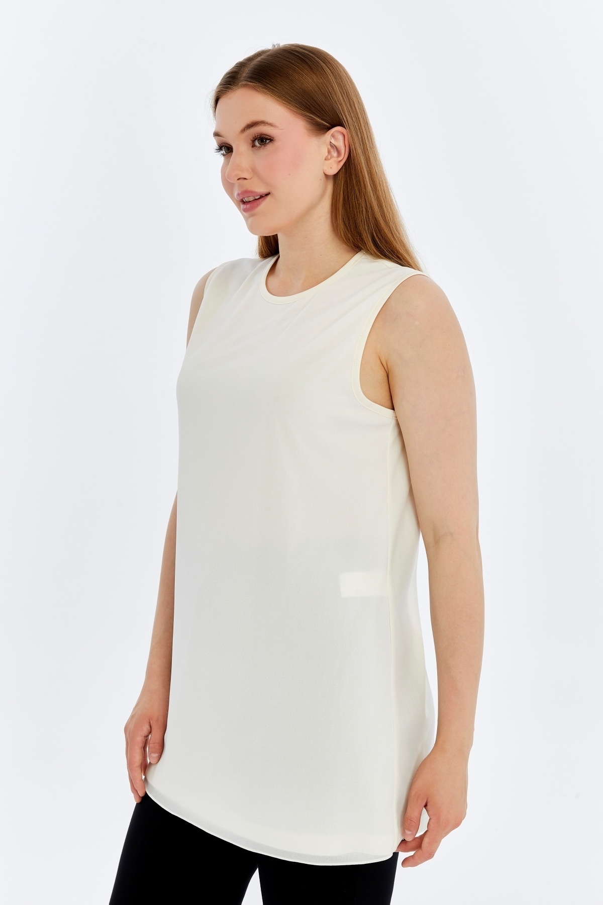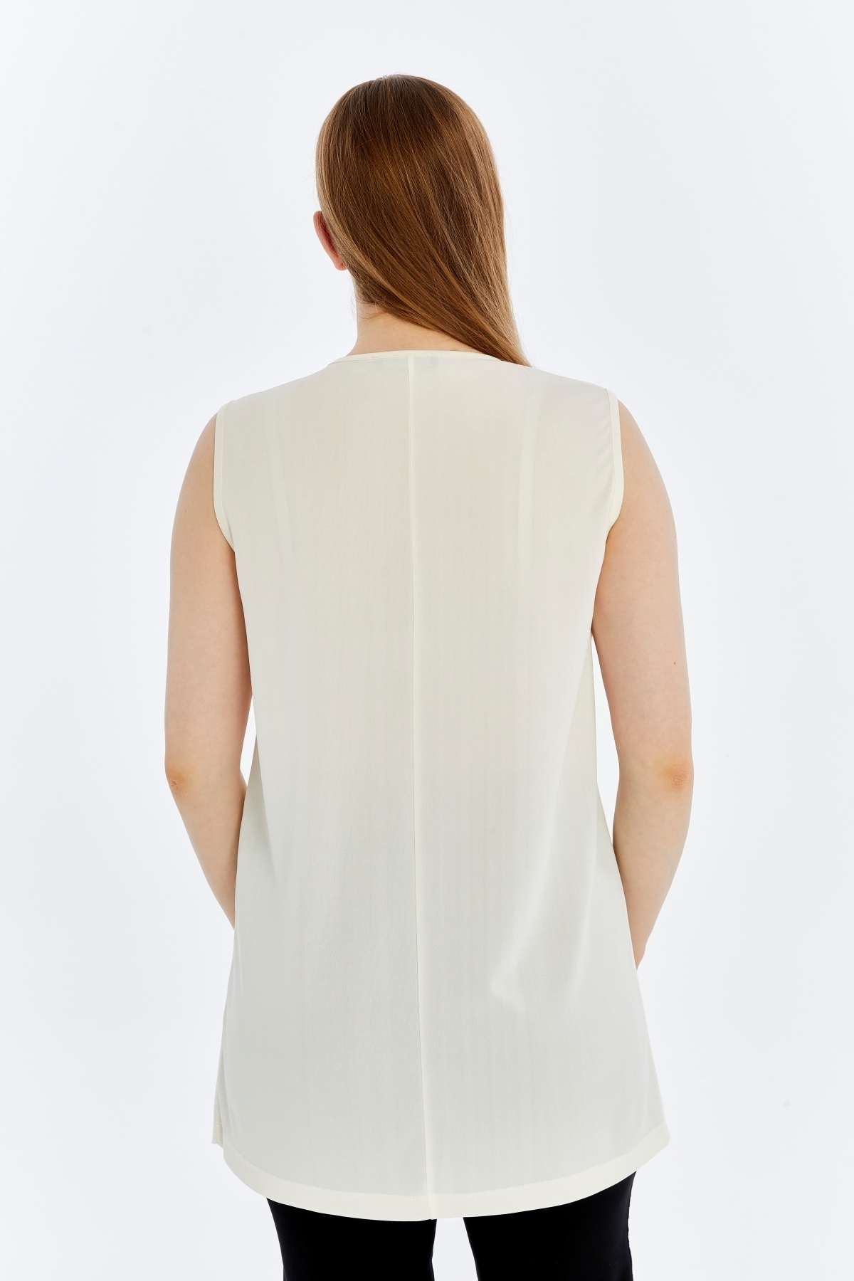- Zarif şifon kaplaması ile tasarlanmış, sıfır yaka ve kolsuz yapısıyla rahat bir kullanım sunar.