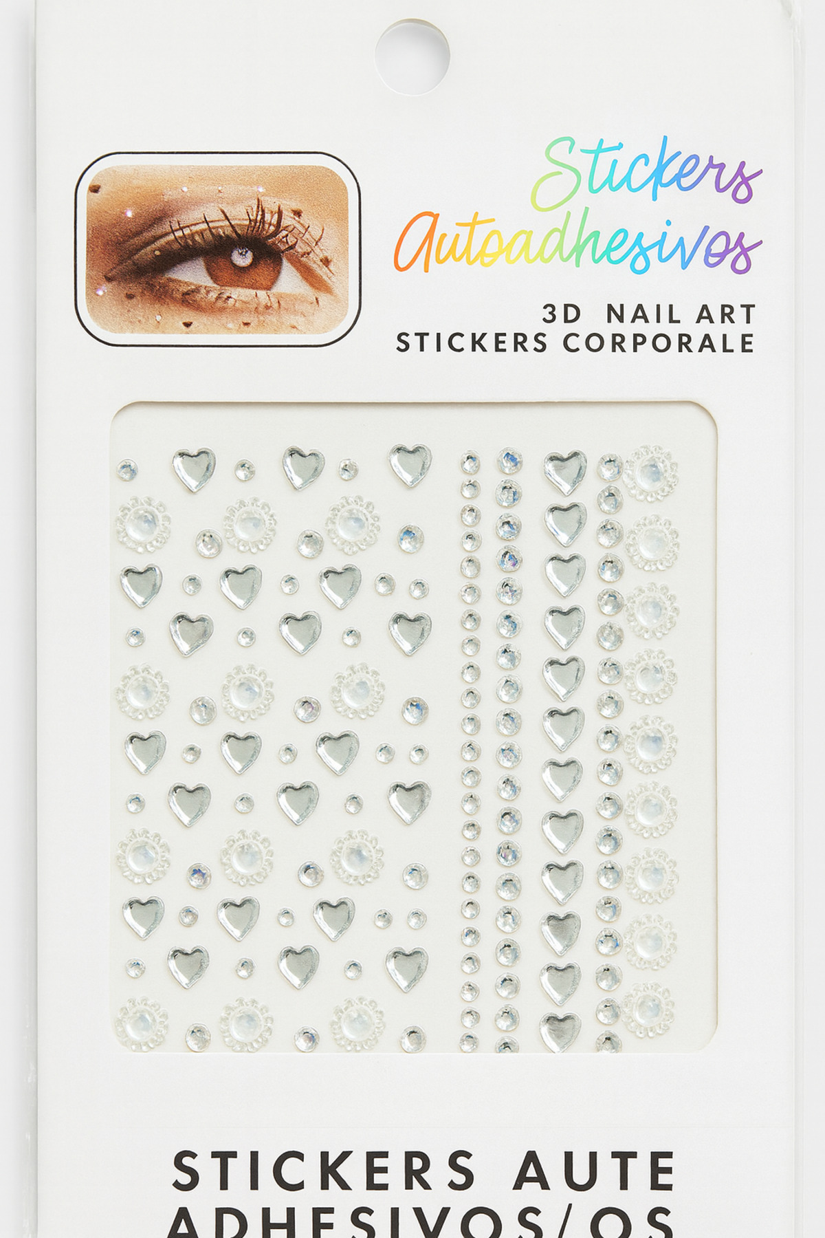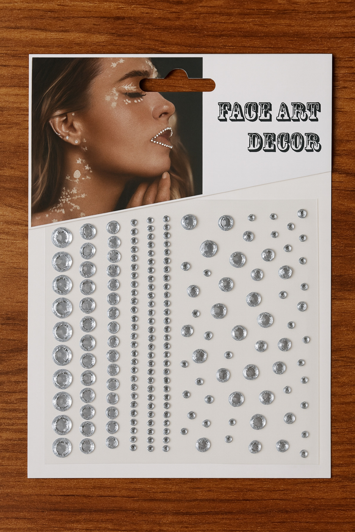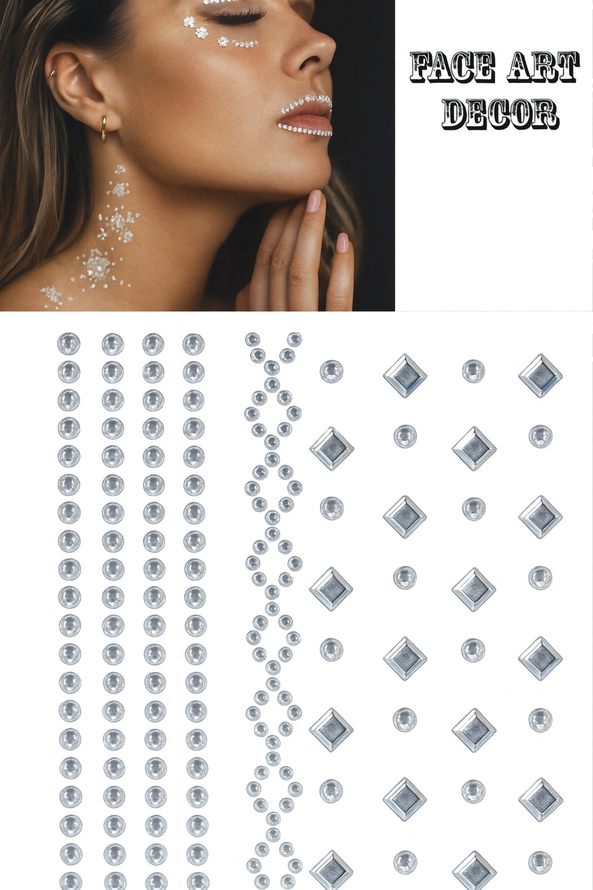 - Parıltılı yüz ve vücut süsleri, kristal görünümlü yapışkanlı tasarımıyla dikkat çeker.