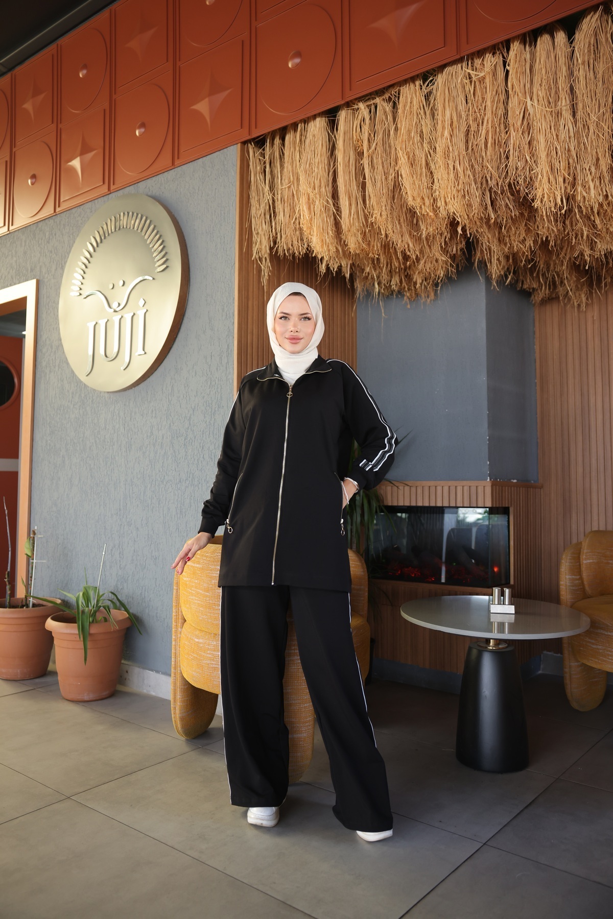 fermuarlı yaka üst ve eşofman altı ile tamamlanmış bir kombin oluşturur.