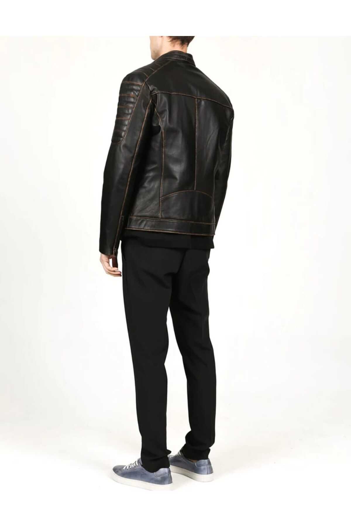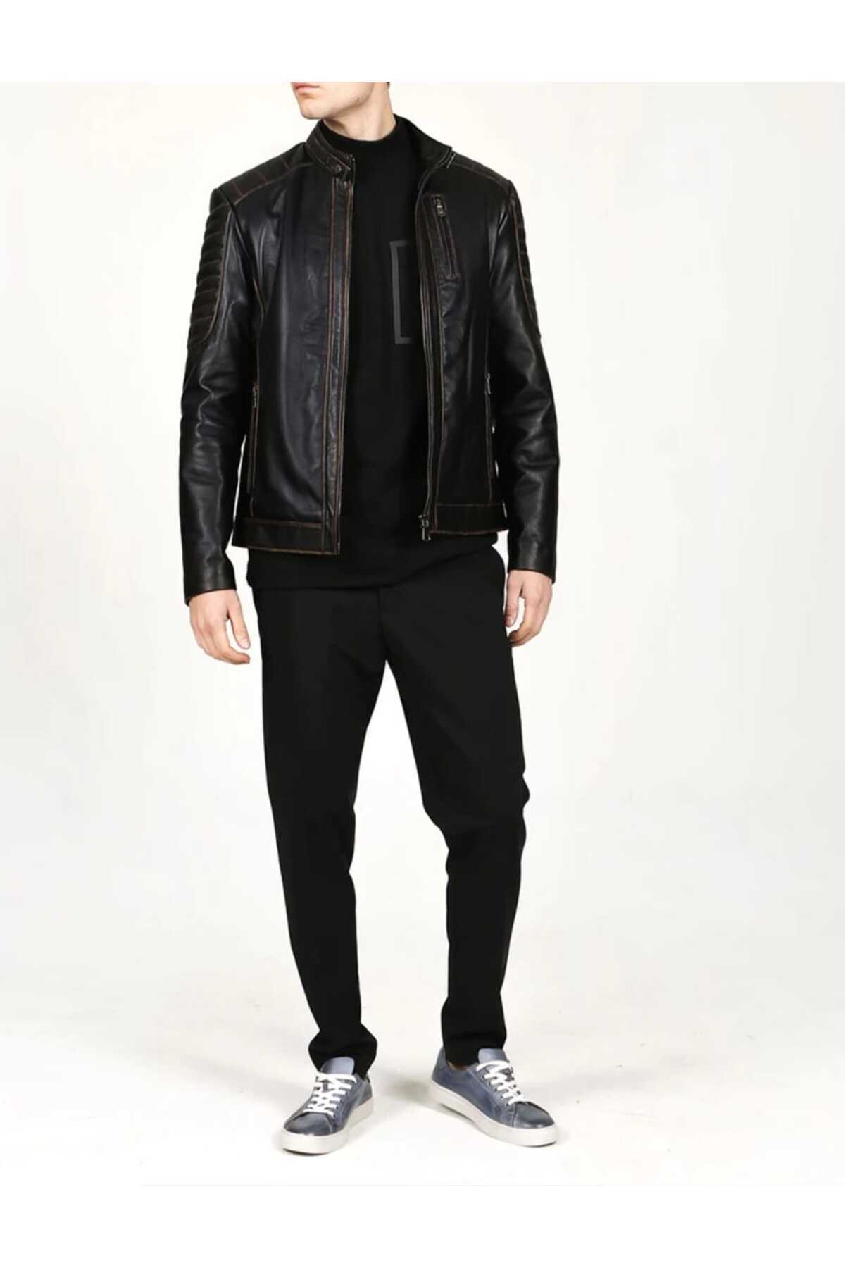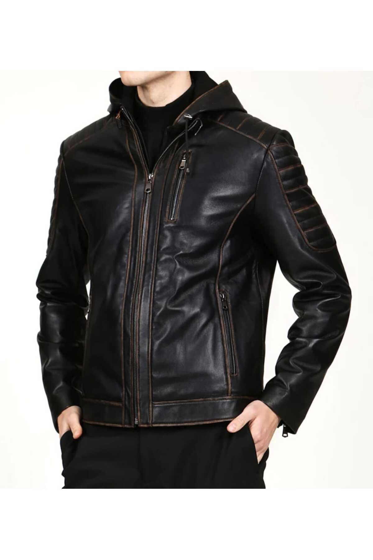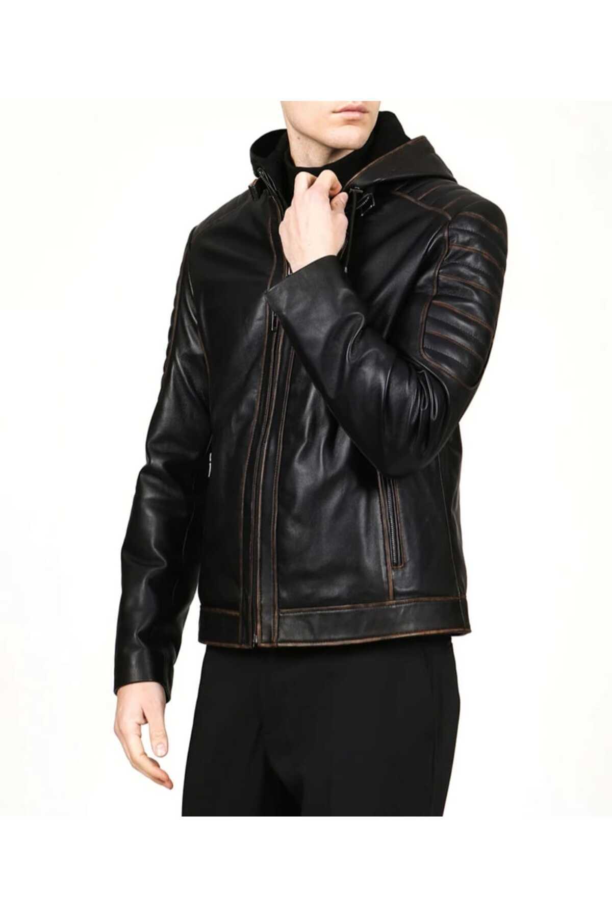 Hakiki Deri Spor Kapüşonlu Kuzu Derisi Erkek Mont